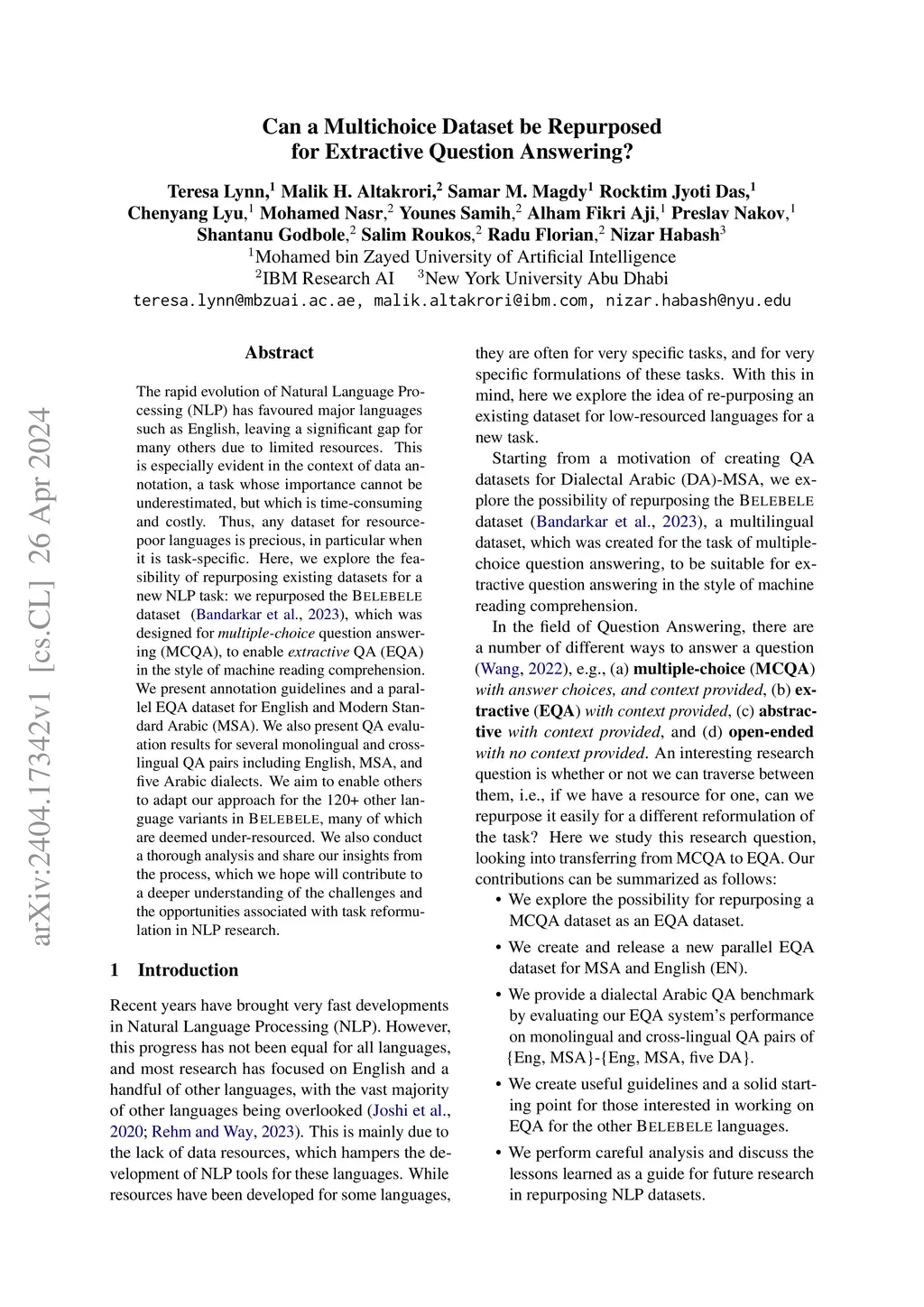 The rapid evolution of Natural Language Processing (NLP) has favoured major languages such as English, leaving a significant gap for many others due to limited resources. This is especially evident in the context of data annotation, a task whose importance cannot be underestimated, but which is time-consuming and costly. Thus, any dataset for resource-poor languages is precious, in particular when it is task-specific. Here, we explore the feasibility of repurposing an existing multilingual dataset for a new NLP task: we repurpose a subset of the BELEBELE dataset (Bandarkar et al., 2023), which was designed for multiple-choice question answering (MCQA), to enable the more practical task of extractive QA (EQA) in the style of machine reading comprehension. We present annotation guidelines and a parallel EQA dataset for English and Modern Standard Arabic (MSA). We also present QA evaluation results for several monolingual and cross-lingual QA pairs including English, MSA, and five Arabic dialects. We aim to help others adapt our approach for the remaining 120 BELEBELE language variants, many of which are deemed under-resourced. We also provide a thorough analysis and share insights to deepen understanding of the challenges and opportunities in NLP task reformulation.