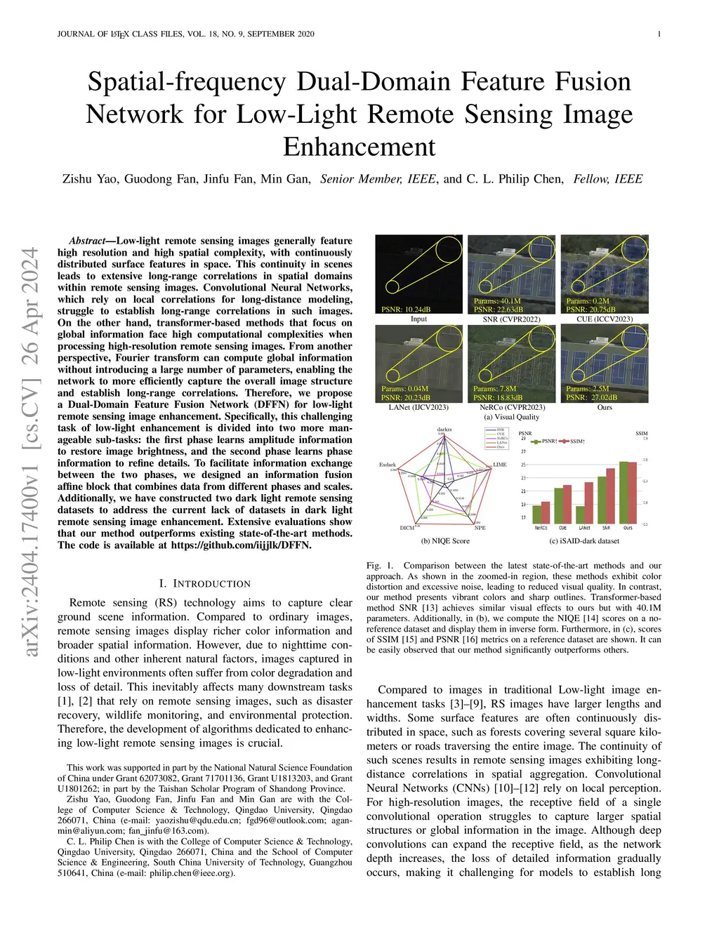 Low-light remote sensing images generally feature high resolution and high spatial complexity, with continuously distributed surface features in space. This continuity in scenes leads to extensive long-range correlations in spatial domains within remote sensing images. Convolutional Neural Networks, which rely on local correlations for long-distance modeling, struggle to establish long-range correlations in such images. On the other hand, transformer-based methods that focus on global information face high computational complexities when processing high-resolution remote sensing images. From another perspective, Fourier transform can compute global information without introducing a large number of parameters, enabling the network to more efficiently capture the overall image structure and establish long-range correlations. Therefore, we propose a Dual-Domain Feature Fusion Network (DFFN) for low-light remote sensing image enhancement. Specifically, this challenging task of low-light enhancement is divided into two more manageable sub-tasks: the first phase learns amplitude information to restore image brightness, and the second phase learns phase information to refine details. To facilitate information exchange between the two phases, we designed an information fusion affine block that combines data from different phases and scales. Additionally, we have constructed two dark light remote sensing datasets to address the current lack of datasets in dark light remote sensing image enhancement. Extensive evaluations show that our method outperforms existing state-of-the-art methods. The code is available at https://github.com/iijjlk/DFFN.