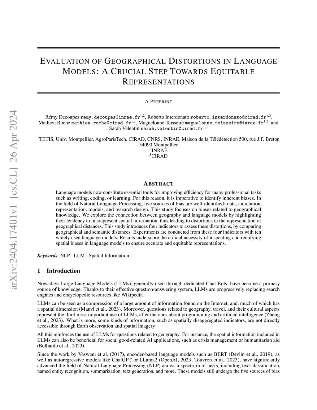 Language models now constitute essential tools for improving efficiency for many professional tasks such as writing, coding, or learning. For this reason, it is imperative to identify inherent biases. In the field of Natural Language Processing, five sources of bias are well-identified: data, annotation, representation, models, and research design. This study focuses on biases related to geographical knowledge. We explore the connection between geography and language models by highlighting their tendency to misrepresent spatial information, thus leading to distortions in the representation of geographical distances. This study introduces four indicators to assess these distortions, by comparing geographical and semantic distances. Experiments are conducted from these four indicators with ten widely used language models. Results underscore the critical necessity of inspecting and rectifying spatial biases in language models to ensure accurate and equitable representations.
