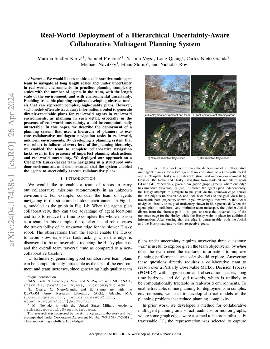 We would like to enable a collaborative multiagent team to navigate at long length scales and under uncertainty in real-world environments. In practice, planning complexity scales with the number of agents in the team, with the length scale of the environment, and with environmental uncertainty. Enabling tractable planning requires developing abstract models that can represent complex, high-quality plans. However, such models often abstract away information needed to generate directly-executable plans for real-world agents in real-world environments, as planning in such detail, especially in the presence of real-world uncertainty, would be computationally intractable. In this paper, we describe the deployment of a planning system that used a hierarchy of planners to execute collaborative multiagent navigation tasks in real-world, unknown environments. By developing a planning system that was robust to failures at every level of the planning hierarchy, we enabled the team to complete collaborative navigation tasks, even in the presence of imperfect planning abstractions and real-world uncertainty. We deployed our approach on a Clearpath Husky-Jackal team navigating in a structured outdoor environment, and demonstrated that the system enabled the agents to successfully execute collaborative plans.