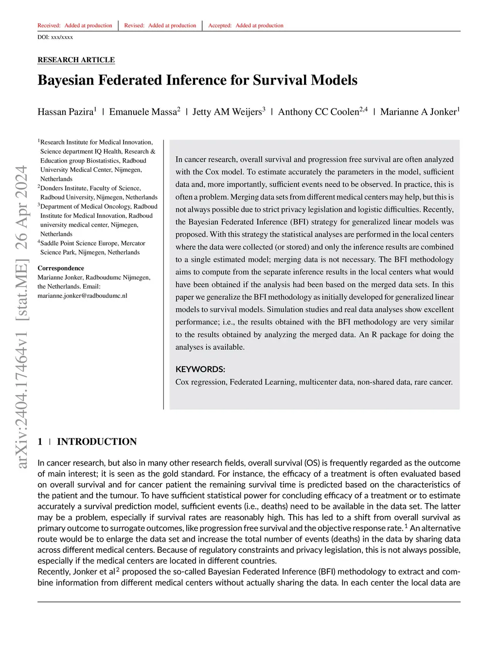 In cancer research, overall survival and progression free survival are often analyzed with the Cox model. To estimate accurately the parameters in the model, sufficient data and, more importantly, sufficient events need to be observed. In practice, this is often a problem. Merging data sets from different medical centers may help, but this is not always possible due to strict privacy legislation and logistic difficulties. Recently, the Bayesian Federated Inference (BFI) strategy for generalized linear models was proposed. With this strategy the statistical analyses are performed in the local centers where the data were collected (or stored) and only the inference results are combined to a single estimated model; merging data is not necessary. The BFI methodology aims to compute from the separate inference results in the local centers what would have been obtained if the analysis had been based on the merged data sets. In this paper we generalize the BFI methodology as initially developed for generalized linear models to survival models. Simulation studies and real data analyses show excellent performance; i.e., the results obtained with the BFI methodology are very similar to the results obtained by analyzing the merged data. An R package for doing the analyses is available.