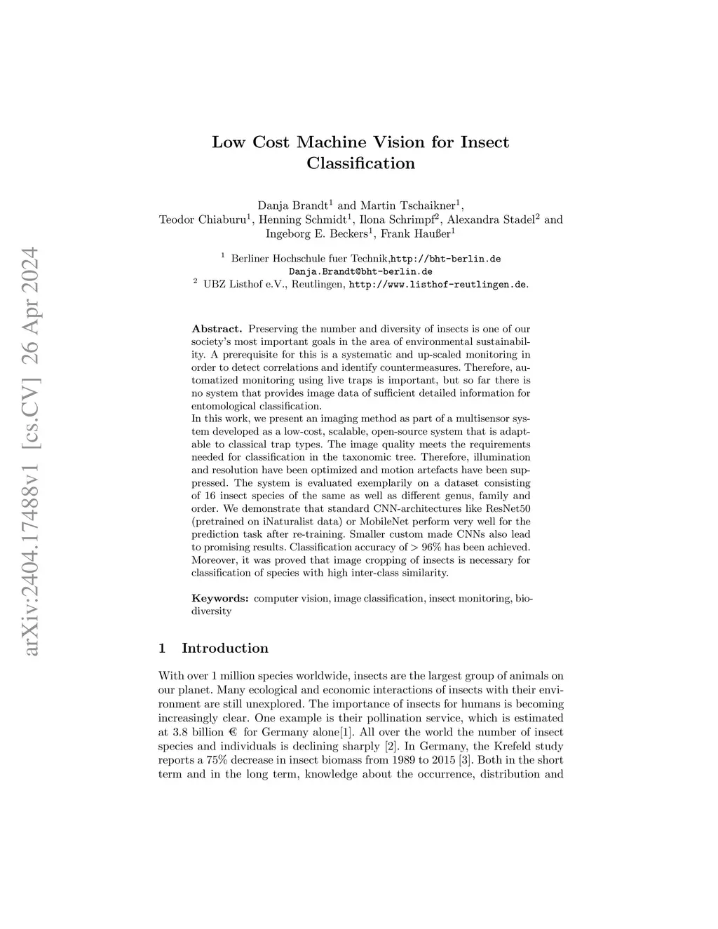 Preserving the number and diversity of insects is one of our society's most important goals in the area of environmental sustainability. A prerequisite for this is a systematic and up-scaled monitoring in order to detect correlations and identify countermeasures. Therefore, automatized monitoring using live traps is important, but so far there is no system that provides image data of sufficient detailed information for entomological classification. In this work, we present an imaging method as part of a multisensor system developed as a low-cost, scalable, open-source system that is adaptable to classical trap types. The image quality meets the requirements needed for classification in the taxonomic tree. Therefore, illumination and resolution have been optimized and motion artefacts have been suppressed. The system is evaluated exemplarily on a dataset consisting of 16 insect species of the same as well as different genus, family and order. We demonstrate that standard CNN-architectures like ResNet50 (pretrained on iNaturalist data) or MobileNet perform very well for the prediction task after re-training. Smaller custom made CNNs also lead to promising results. Classification accuracy of has been achieved. Moreover, it was proved that image cropping of insects is necessary for classification of species with high inter-class similarity.
