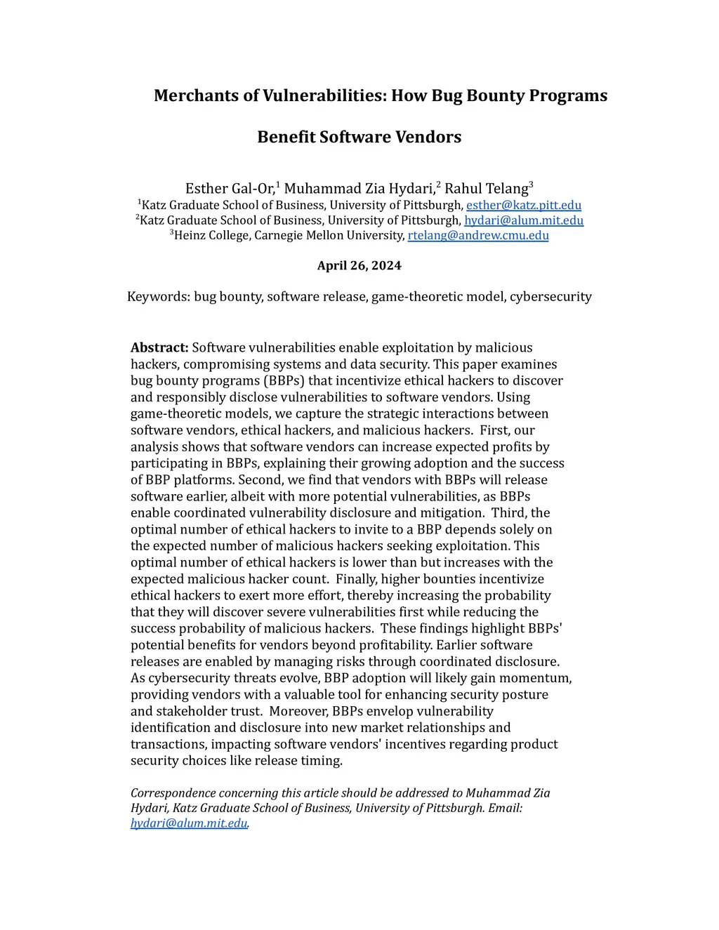 Software vulnerabilities enable exploitation by malicious hackers, compromising systems and data security. This paper examines bug bounty programs (BBPs) that incentivize ethical hackers to discover and responsibly disclose vulnerabilities to software vendors. Using game-theoretic models, we capture the strategic interactions between software vendors, ethical hackers, and malicious hackers. First, our analysis shows that software vendors can increase expected profits by participating in BBPs, explaining their growing adoption and the success of BBP platforms. Second, we find that vendors with BBPs will release software earlier, albeit with more potential vulnerabilities, as BBPs enable coordinated vulnerability disclosure and mitigation. Third, the optimal number of ethical hackers to invite to a BBP depends solely on the expected number of malicious hackers seeking exploitation. This optimal number of ethical hackers is lower than but increases with the expected malicious hacker count. Finally, higher bounties incentivize ethical hackers to exert more effort, thereby increasing the probability that they will discover severe vulnerabilities first while reducing the success probability of malicious hackers. These findings highlight BBPs' potential benefits for vendors beyond profitability. Earlier software releases are enabled by managing risks through coordinated disclosure. As cybersecurity threats evolve, BBP adoption will likely gain momentum, providing vendors with a valuable tool for enhancing security posture and stakeholder trust. Moreover, BBPs envelop vulnerability identification and disclosure into new market relationships and transactions, impacting software vendors' incentives regarding product security choices like release timing.