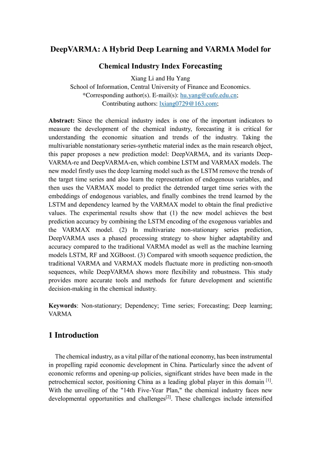 Since the chemical industry index is one of the important indicators to measure the development of the chemical industry, forecasting it is critical for understanding the economic situation and trends of the industry. Taking the multivariable nonstationary series-synthetic material index as the main research object, this paper proposes a new prediction model: DeepVARMA, and its variants Deep-VARMA-re and DeepVARMA-en, which combine LSTM and VARMAX models. The new model firstly uses the deep learning model such as the LSTM remove the trends of the target time series and also learn the representation of endogenous variables, and then uses the VARMAX model to predict the detrended target time series with the embeddings of endogenous variables, and finally combines the trend learned by the LSTM and dependency learned by the VARMAX model to obtain the final predictive values. The experimental results show that (1) the new model achieves the best prediction accuracy by combining the LSTM encoding of the exogenous variables and the VARMAX model. (2) In multivariate non-stationary series prediction, DeepVARMA uses a phased processing strategy to show higher adaptability and accuracy compared to the traditional VARMA model as well as the machine learning models LSTM, RF and XGBoost. (3) Compared with smooth sequence prediction, the traditional VARMA and VARMAX models fluctuate more in predicting non-smooth sequences, while DeepVARMA shows more flexibility and robustness. This study provides more accurate tools and methods for future development and scientific decision-making in the chemical industry.