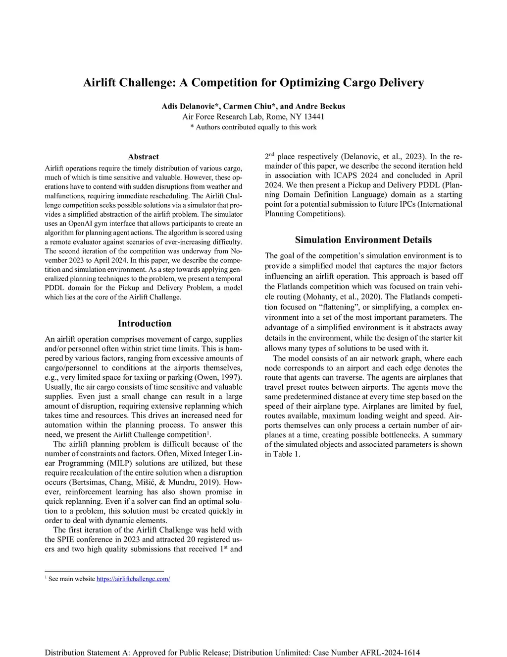 Airlift operations require the timely distribution of various cargo, much of which is time sensitive and valuable. These operations, however, have to contend with sudden disruptions from weather and malfunctions, requiring immediate rescheduling. The Airlift Challenge competition seeks possible solutions via a simulator that provides a simplified abstraction of the airlift problem. The simulator uses an OpenAI gym interface that allows participants to create an algorithm for planning agent actions. The algorithm is scored using a remote evaluator against scenarios of ever-increasing difficulty. The second iteration of the competition was underway from November 2023 to April 2024. This paper describes the competition, simulation environment, and results. As a step towards applying generalized planning techniques to the problem, a temporal PDDL domain is presented for the Pickup and Delivery Problem, a model which lies at the core of the Airlift Challenge.