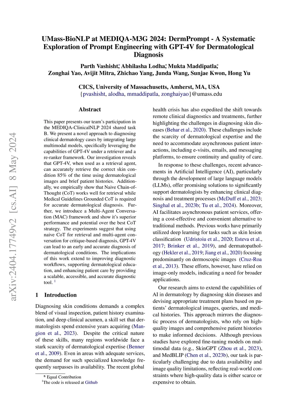 This paper presents our team's participation in the MEDIQA-ClinicalNLP2024 shared task B. We present a novel approach to diagnosing clinical dermatology cases by integrating large multimodal models, specifically leveraging the capabilities of GPT-4V under a retriever and a re-ranker framework. Our investigation reveals that GPT-4V, when used as a retrieval agent, can accurately retrieve the correct skin condition 85% of the time using dermatological images and brief patient histories. Additionally, we empirically show that Naive Chain-of-Thought (CoT) works well for retrieval while Medical Guidelines Grounded CoT is required for accurate dermatological diagnosis. Further, we introduce a Multi-Agent Conversation (MAC) framework and show its superior performance and potential over the best CoT strategy. The experiments suggest that using naive CoT for retrieval and multi-agent conversation for critique-based diagnosis, GPT-4V can lead to an early and accurate diagnosis of dermatological conditions. The implications of this work extend to improving diagnostic workflows, supporting dermatological education, and enhancing patient care by providing a scalable, accessible, and accurate diagnostic tool.