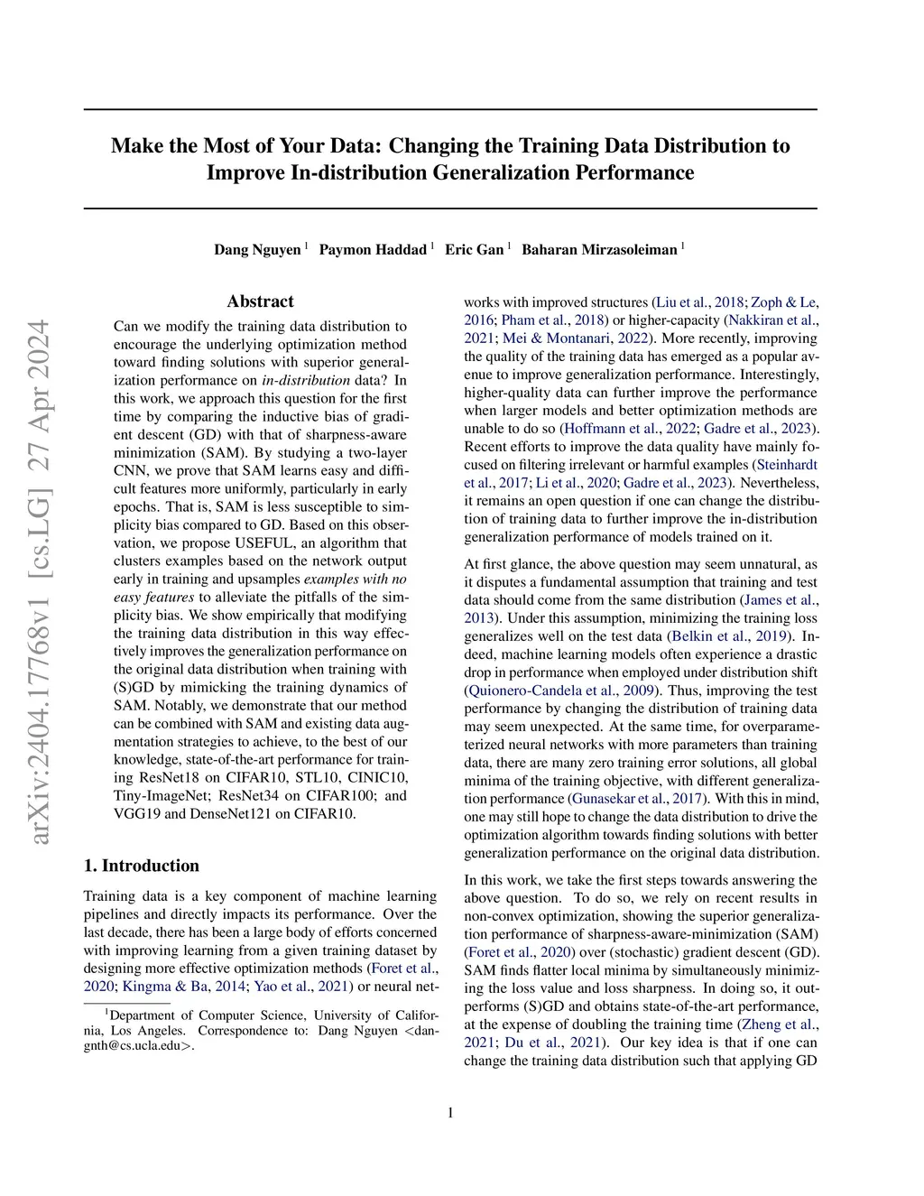 Can we modify the training data distribution to encourage the underlying optimization method toward finding solutions with superior generalization performance on in-distribution data? In this work, we approach this question for the first time by comparing the inductive bias of gradient descent (GD) with that of sharpness-aware minimization (SAM). By studying a two-layer CNN, we rigorously prove that SAM learns different features more uniformly, particularly in early epochs. That is, SAM is less susceptible to simplicity bias compared to GD. We also show that examples containing features that are learned early are separable from the rest based on the model's output. Based on this observation, we propose a method that (i) clusters examples based on the network output early in training, (ii) identifies a cluster of examples with similar network output, and (iii) upsamples the rest of examples only once to alleviate the simplicity bias. We show empirically that USEFUL effectively improves the generalization performance on the original data distribution when training with various gradient methods, including (S)GD and SAM. Notably, we demonstrate that our method can be combined with SAM variants and existing data augmentation strategies to achieve, to the best of our knowledge, state-of-the-art performance for training ResNet18 on CIFAR10, STL10, CINIC10, Tiny-ImageNet; ResNet34 on CIFAR100; and VGG19 and DenseNet121 on CIFAR10. Our code is available atthis https URL.