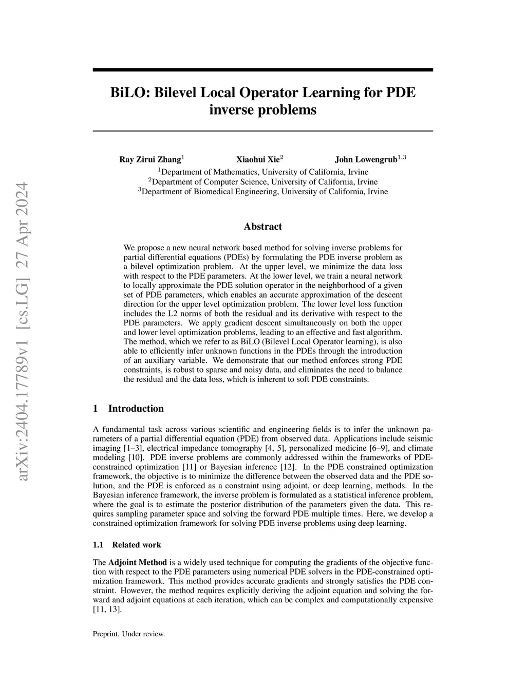 We propose a new neural network based method for solving inverse problems for partial differential equations (PDEs) by formulating the PDE inverse problem as a bilevel optimization problem. At the upper level, we minimize the data loss with respect to the PDE parameters. At the lower level, we train a neural network to locally approximate the PDE solution operator in the neighborhood of a given set of PDE parameters, which enables an accurate approximation of the descent direction for the upper level optimization problem. The lower level loss function includes the L2 norms of both the residual and its derivative with respect to the PDE parameters. We apply gradient descent simultaneously on both the upper and lower level optimization problems, leading to an effective and fast algorithm. The method, which we refer to as BiLO (Bilevel Local Operator learning), is also able to efficiently infer unknown functions in the PDEs through the introduction of an auxiliary variable. We provide a theoretical analysis that justifies our approach. Through extensive experiments over multiple PDE systems, we demonstrate that our method enforces strong PDE constraints, is robust to sparse and noisy data, and eliminates the need to balance the residual and the data loss, which is inherent to the soft PDE constraints in many existing methods.