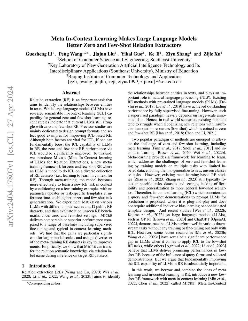 Relation extraction (RE) is an important task that aims to identify the relationships between entities in texts. While large language models (LLMs) have revealed remarkable in-context learning (ICL) capability for general zero and few-shot learning, recent studies indicate that current LLMs still struggle with zero and few-shot RE. Previous studies are mainly dedicated to design prompt formats and select good examples for improving ICL-based RE. Although both factors are vital for ICL, if one can fundamentally boost the ICL capability of LLMs in RE, the zero and few-shot RE performance via ICL would be significantly improved. To this end, we introduce \textsc{Micre} (\textbf{M}eta \textbf{I}n-\textbf{C}ontext learning of LLMs for \textbf{R}elation \textbf{E}xtraction), a new meta-training framework for zero and few-shot RE where an LLM is tuned to do ICL on a diverse collection of RE datasets (i.e., learning to learn in context for RE). Through meta-training, the model becomes more effectively to learn a new RE task in context by conditioning on a few training examples with no parameter updates or task-specific templates at inference time, enabling better zero and few-shot task generalization. We experiment \textsc{Micre} on various LLMs with different model scales and 12 public RE datasets, and then evaluate it on unseen RE benchmarks under zero and few-shot settings. \textsc{Micre} delivers comparable or superior performance compared to a range of baselines including supervised fine-tuning and typical in-context learning methods. We find that the gains are particular significant for larger model scales, and using a diverse set of the meta-training RE datasets is key to improvements. Empirically, we show that \textsc{Micre} can transfer the relation semantic knowledge via relation label name during inference on target RE datasets.