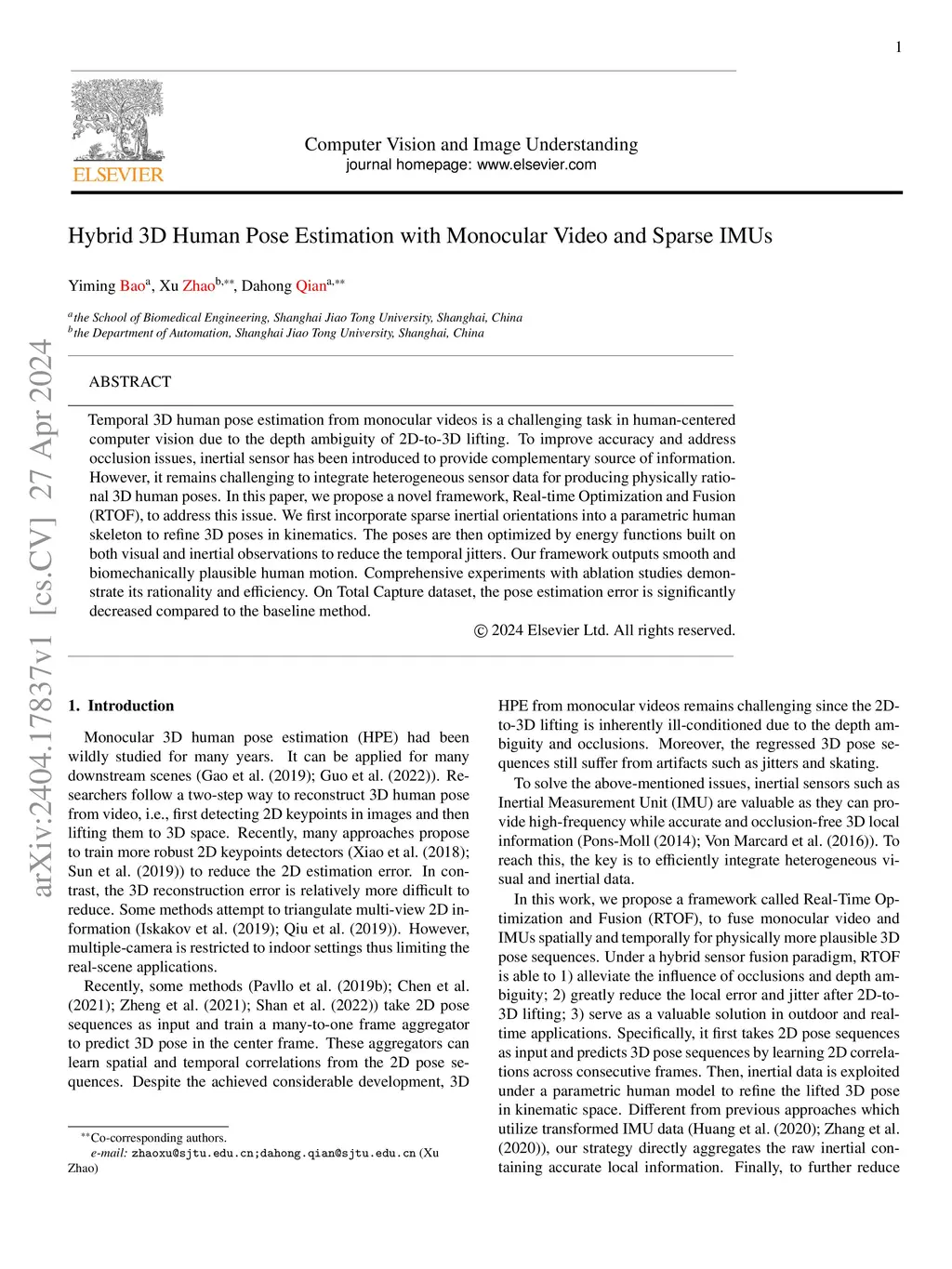 Temporal 3D human pose estimation from monocular videos is a challenging task in human-centered computer vision due to the depth ambiguity of 2D-to-3D lifting. To improve accuracy and address occlusion issues, inertial sensor has been introduced to provide complementary source of information. However, it remains challenging to integrate heterogeneous sensor data for producing physically rational 3D human poses. In this paper, we propose a novel framework, Real-time Optimization and Fusion (RTOF), to address this issue. We first incorporate sparse inertial orientations into a parametric human skeleton to refine 3D poses in kinematics. The poses are then optimized by energy functions built on both visual and inertial observations to reduce the temporal jitters. Our framework outputs smooth and biomechanically plausible human motion. Comprehensive experiments with ablation studies demonstrate its rationality and efficiency. On Total Capture dataset, the pose estimation error is significantly decreased compared to the baseline method.