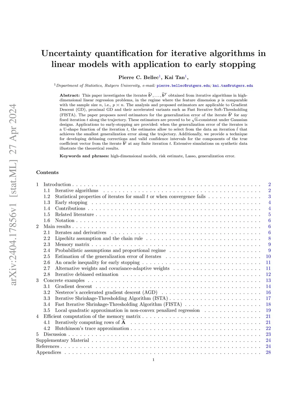 This paper investigates the iterates obtained from iterative algorithms in high-dimensional linear regression problems, in the regime where the feature dimension is comparable with the sample size , i.e., . The analysis and proposed estimators are applicable to Gradient Descent (GD), proximal GD and their accelerated variants such as Fast Iterative Soft-Thresholding (FISTA). The paper proposes novel estimators for the generalization error of the iterate for any fixed iteration along the trajectory. These estimators are proved to be -consistent under Gaussian designs. Applications to early-stopping are provided: when the generalization error of the iterates is a U-shape function of the iteration , the estimates allow to select from the data an iteration that achieves the smallest generalization error along the trajectory. Additionally, we provide a technique for developing debiasing corrections and valid confidence intervals for the components of the true coefficient vector from the iterate at any finite iteration . Extensive simulations on synthetic data illustrate the theoretical results.