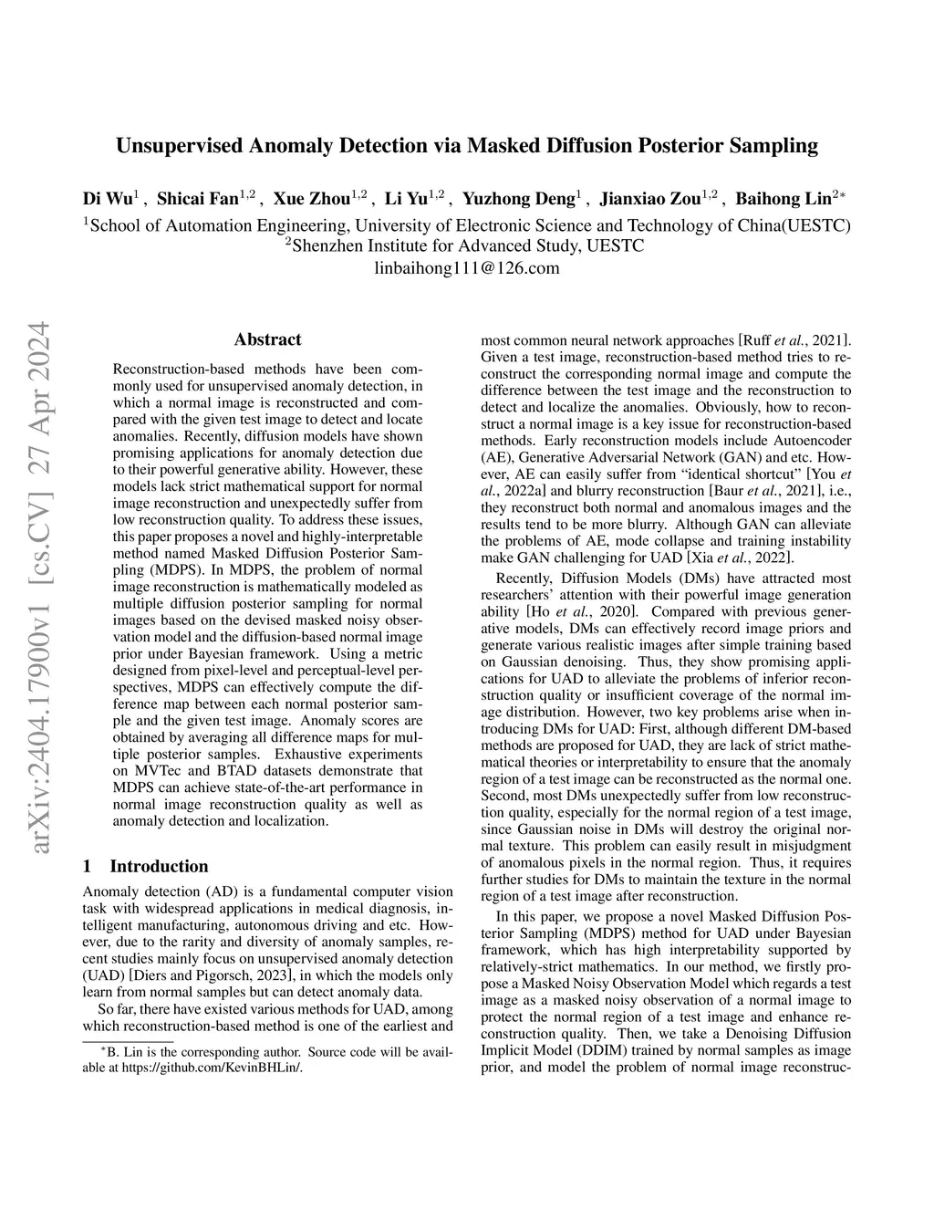 Reconstruction-based methods have been commonly used for unsupervised anomaly detection, in which a normal image is reconstructed and compared with the given test image to detect and locate anomalies. Recently, diffusion models have shown promising applications for anomaly detection due to their powerful generative ability. However, these models lack strict mathematical support for normal image reconstruction and unexpectedly suffer from low reconstruction quality. To address these issues, this paper proposes a novel and highly-interpretable method named Masked Diffusion Posterior Sampling (MDPS). In MDPS, the problem of normal image reconstruction is mathematically modeled as multiple diffusion posterior sampling for normal images based on the devised masked noisy observation model and the diffusion-based normal image prior under Bayesian framework. Using a metric designed from pixel-level and perceptual-level perspectives, MDPS can effectively compute the difference map between each normal posterior sample and the given test image. Anomaly scores are obtained by averaging all difference maps for multiple posterior samples. Exhaustive experiments on MVTec and BTAD datasets demonstrate that MDPS can achieve state-of-the-art performance in normal image reconstruction quality as well as anomaly detection and localization.