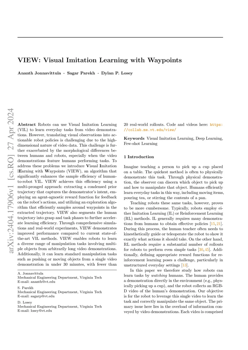 Robots can use Visual Imitation Learning (VIL) to learn manipulation tasks from video demonstrations. However, translating visual observations into actionable robot policies is challenging due to the high-dimensional nature of video data. This challenge is further exacerbated by the morphological differences between humans and robots, especially when the video demonstrations feature humans performing tasks. To address these problems we introduce Visual Imitation lEarning with Waypoints (VIEW), an algorithm that significantly enhances the sample efficiency of human-to-robot VIL. VIEW achieves this efficiency using a multi-pronged approach: extracting a condensed prior trajectory that captures the demonstrator's intent, employing an agent-agnostic reward function for feedback on the robot's actions, and utilizing an exploration algorithm that efficiently samples around waypoints in the extracted trajectory. VIEW also segments the human trajectory into grasp and task phases to further accelerate learning efficiency. Through comprehensive simulations and real-world experiments, VIEW demonstrates improved performance compared to current state-of-the-art VIL methods. VIEW enables robots to learn manipulation tasks involving multiple objects from arbitrarily long video demonstrations. Additionally, it can learn standard manipulation tasks such as pushing or moving objects from a single video demonstration in under 30 minutes, with fewer than 20 real-world rollouts. Code and videos here:this https URL