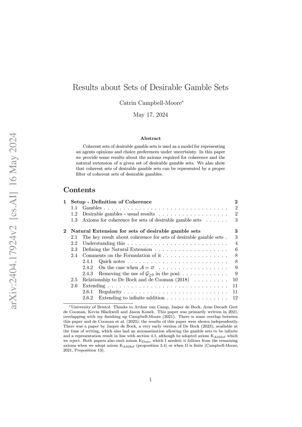 Coherent sets of desirable gamble sets is used as a model for representing an agents opinions and choice preferences under uncertainty. In this paper we provide some results about the axioms required for coherence and the natural extension of a given set of desirable gamble sets. We also show that coherent sets of desirable gamble sets can be represented by a proper filter of coherent sets of desirable gambles.