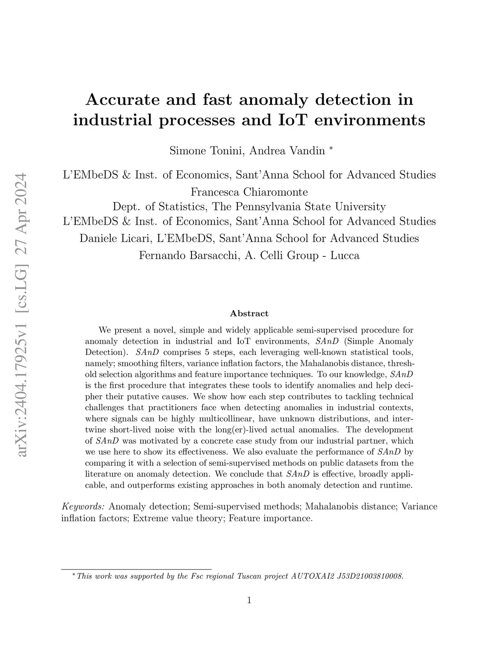 We present a novel, simple and widely applicable semi-supervised procedure for anomaly detection in industrial and IoT environments, SAnD (Simple Anomaly Detection). SAnD comprises 5 steps, each leveraging well-known statistical tools, namely; smoothing filters, variance inflation factors, the Mahalanobis distance, threshold selection algorithms and feature importance techniques. To our knowledge, SAnD is the first procedure that integrates these tools to identify anomalies and help decipher their putative causes. We show how each step contributes to tackling technical challenges that practitioners face when detecting anomalies in industrial contexts, where signals can be highly multicollinear, have unknown distributions, and intertwine short-lived noise with the long(er)-lived actual anomalies. The development of SAnD was motivated by a concrete case study from our industrial partner, which we use here to show its effectiveness. We also evaluate the performance of SAnD by comparing it with a selection of semi-supervised methods on public datasets from the literature on anomaly detection. We conclude that SAnD is effective, broadly applicable, and outperforms existing approaches in both anomaly detection and runtime.