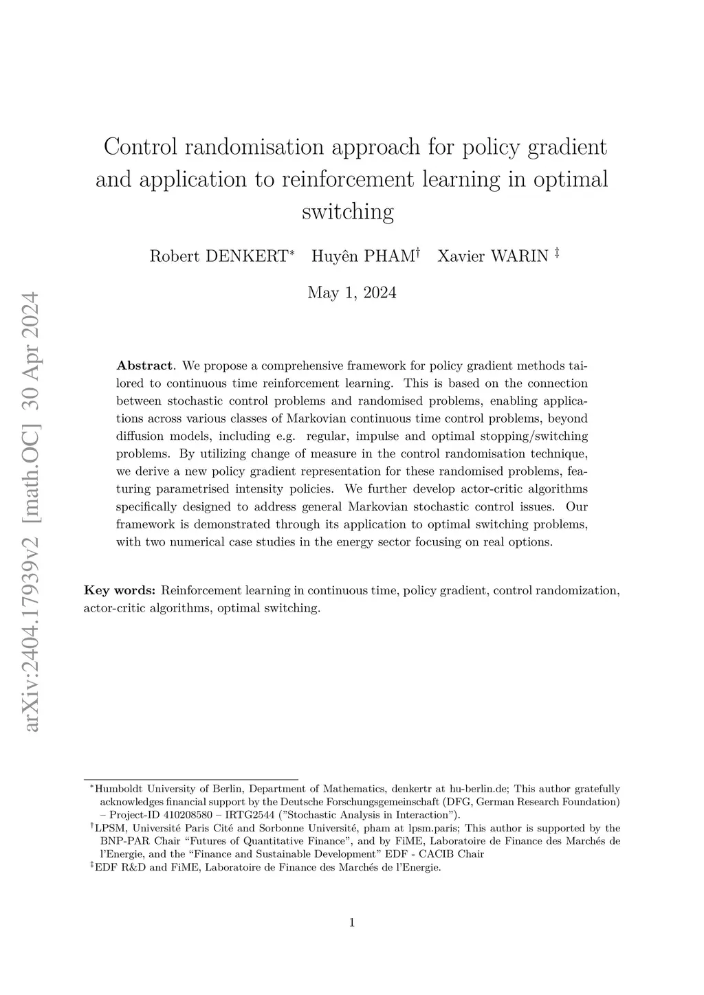 Control randomisation approach for policy gradient and application to