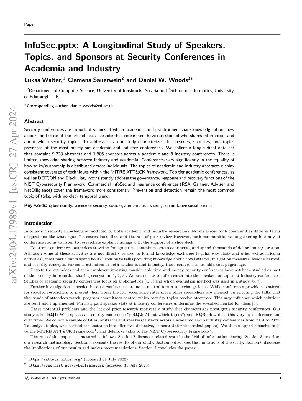 Security conferences are important venues for information sharing, where academics and practitioners share knowledge about new attacks and state-of-the-art defenses. Despite their importance, researchers have not systematically examined who shares information and which security topics are discussed. To address this gap, our paper characterizes the speakers, sponsors, and topics presented at prestigious academic and industry security conferences. We compile a longitudinal dataset containing 9,728 abstracts and 1,686 sponsors across four academic and six industry conferences. Our findings show limited information sharing between industry and academia. Conferences vary significantly in how equitably talks and authorship are distributed across individuals. The topics of academic and industry abstracts display consistent coverage of techniques within the MITRE ATT&CK framework. Top-tier academic conferences, as well as DEFCON and Black Hat, address the governance, response, and recovery functions of the NIST Cybersecurity Framework inconsistently. Commercial information security and insurance conferences (RSA, Gartner, Advisen and NetDiligence) more consistently cover the framework. Prevention and detection were the most common topics in the sample period, with no clear temporal trends.