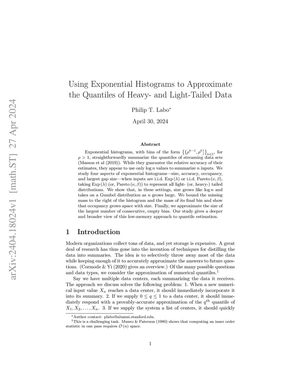 Exponential histograms, with bins of the form , for , straightforwardly summarize the quantiles of streaming data sets (Masson et al. 2019). While they guarantee the relative accuracy of their estimates, they appear to use only values to summarize inputs. We study four aspects of exponential histograms -- size, accuracy, occupancy, and largest gap size -- when inputs are i.i.d. or i.i.d. , taking (or, ) to represent all light- (or, heavy-) tailed distributions. We show that, in these settings, size grows like and takes on a Gumbel distribution as grows large. We bound the missing mass to the right of the histogram and the mass of its final bin and show that occupancy grows apace with size. Finally, we approximate the size of the largest number of consecutive, empty bins. Our study gives a deeper and broader view of this low-memory approach to quantile estimation.