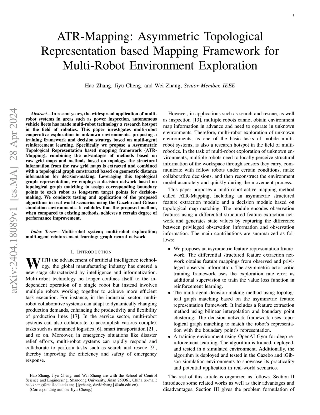 In recent years, the widespread application of multi-robot systems in areas such as power inspection, autonomous vehicle fleets has made multi-robot technology a research hotspot in the field of robotics. This paper investigates multi-robot cooperative exploration in unknown environments, proposing a training framework and decision strategy based on multi-agent reinforcement learning. Specifically we propose a Asymmetric Topological Representation based mapping framework (ATR-Mapping), combining the advantages of methods based on raw grid maps and methods based on topology, the structural information from the raw grid maps is extracted and combined with a topological graph constructed based on geometric distance information for decision-making. Leveraging this topological graph representation, we employs a decision network based on topological graph matching to assign corresponding boundary points to each robot as long-term target points for decision-making. We conducts testing and application of the proposed algorithms in real world scenarios using the Gazebo and Gibson simulation environments. It validates that the proposed method, when compared to existing methods, achieves a certain degree of performance improvement.