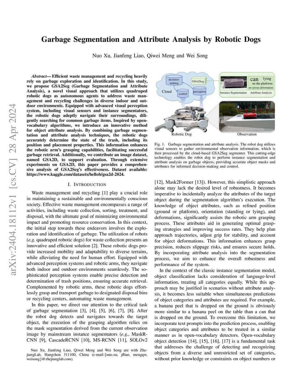 Efficient waste management and recycling heavily rely on garbage exploration and identification. In this study, we propose GSA2Seg (Garbage Segmentation and Attribute Analysis), a novel visual approach that utilizes quadruped robotic dogs as autonomous agents to address waste management and recycling challenges in diverse indoor and outdoor environments. Equipped with advanced visual perception system, including visual sensors and instance segmentators, the robotic dogs adeptly navigate their surroundings, diligently searching for common garbage items. Inspired by open-vocabulary algorithms, we introduce an innovative method for object attribute analysis. By combining garbage segmentation and attribute analysis techniques, the robotic dogs accurately determine the state of the trash, including its position and placement properties. This information enhances the robotic arm's grasping capabilities, facilitating successful garbage retrieval. Additionally, we contribute an image dataset, named GSA2D, to support evaluation. Through extensive experiments on GSA2D, this paper provides a comprehensive analysis of GSA2Seg's effectiveness. Dataset available: \href{https://www.kaggle.com/datasets/hellob/gsa2d-2024}{https://www.kaggle.com/datasets/hellob/gsa2d-2024}.