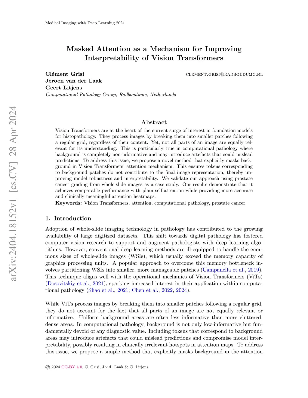 Vision Transformers are at the heart of the current surge of interest in foundation models for histopathology. They process images by breaking them into smaller patches following a regular grid, regardless of their content. Yet, not all parts of an image are equally relevant for its understanding. This is particularly true in computational pathology where background is completely non-informative and may introduce artefacts that could mislead predictions. To address this issue, we propose a novel method that explicitly masks background in Vision Transformers' attention mechanism. This ensures tokens corresponding to background patches do not contribute to the final image representation, thereby improving model robustness and interpretability. We validate our approach using prostate cancer grading from whole-slide images as a case study. Our results demonstrate that it achieves comparable performance with plain self-attention while providing more accurate and clinically meaningful attention heatmaps.