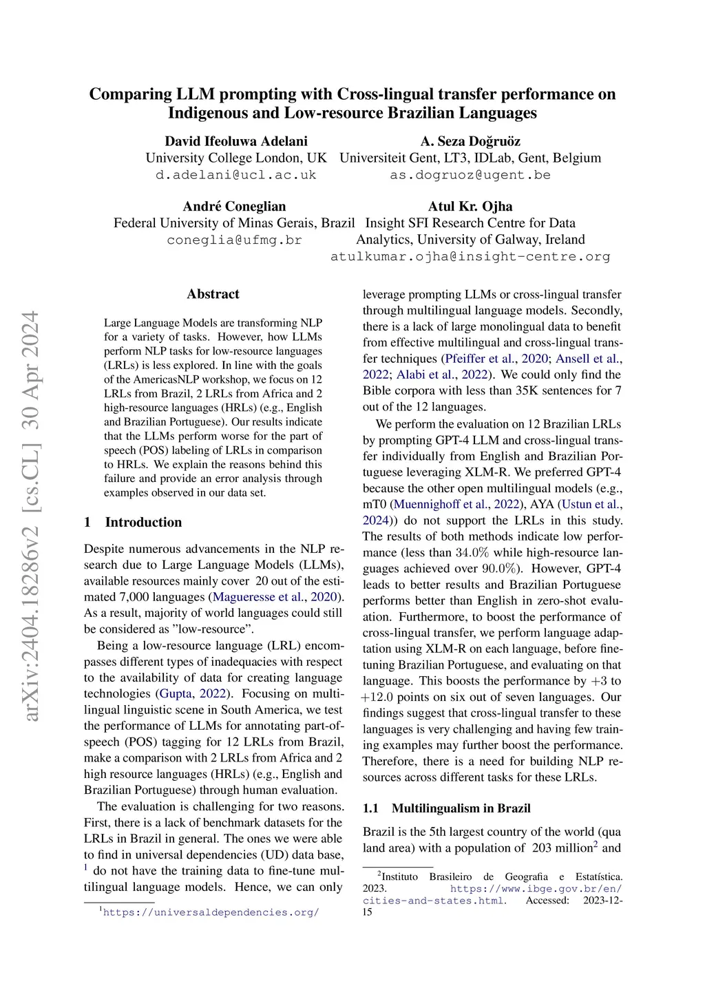 Large Language Models are transforming NLP for a variety of tasks. However, how LLMs perform NLP tasks for low-resource languages (LRLs) is less explored. In line with the goals of the AmericasNLP workshop, we focus on 12 LRLs from Brazil, 2 LRLs from Africa and 2 high-resource languages (HRLs) (e.g., English and Brazilian Portuguese). Our results indicate that the LLMs perform worse for the part of speech (POS) labeling of LRLs in comparison to HRLs. We explain the reasons behind this failure and provide an error analysis through examples observed in our data set.