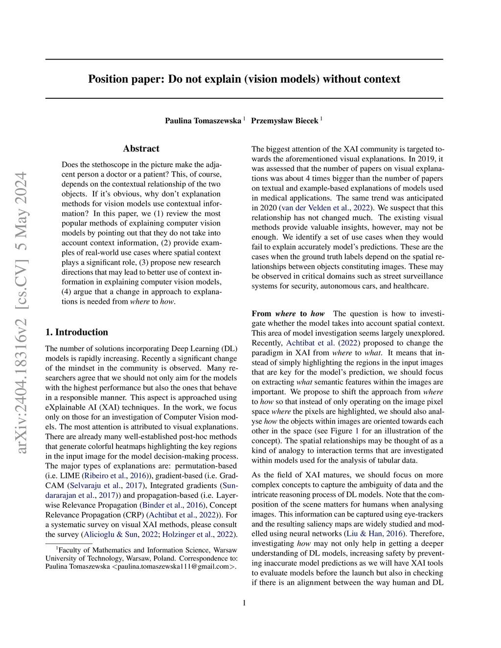 Does the stethoscope in the picture make the adjacent person a doctor or a patient? This, of course, depends on the contextual relationship of the two objects. If it's obvious, why don't explanation methods for vision models use contextual information? In this paper, we (1) review the most popular methods of explaining computer vision models by pointing out that they do not take into account context information, (2) show examples of failures of popular XAI methods, (3) provide examples of real-world use cases where spatial context plays a significant role, (4) propose new research directions that may lead to better use of context information in explaining computer vision models, (5) argue that a change in approach to explanations is needed from 'where' to 'how'.