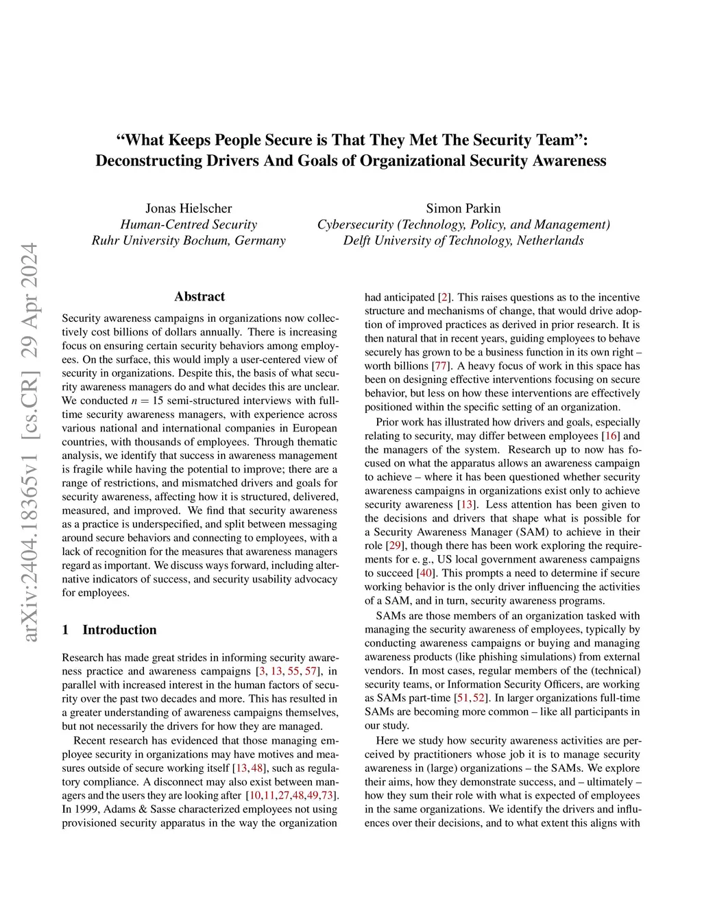 Security awareness campaigns in organizations now collectively cost billions of dollars annually. There is increasing focus on ensuring certain security behaviors among employees. On the surface, this would imply a user-centered view of security in organizations. Despite this, the basis of what security awareness managers do and what decides this are unclear. We conducted n=15 semi-structured interviews with full-time security awareness managers, with experience across various national and international companies in European countries, with thousands of employees. Through thematic analysis, we identify that success in awareness management is fragile while having the potential to improve; there are a range of restrictions, and mismatched drivers and goals for security awareness, affecting how it is structured, delivered, measured, and improved. We find that security awareness as a practice is underspecified, and split between messaging around secure behaviors and connecting to employees, with a lack of recognition for the measures that awareness managers regard as important. We discuss ways forward, including alternative indicators of success, and security usability advocacy for employees.
