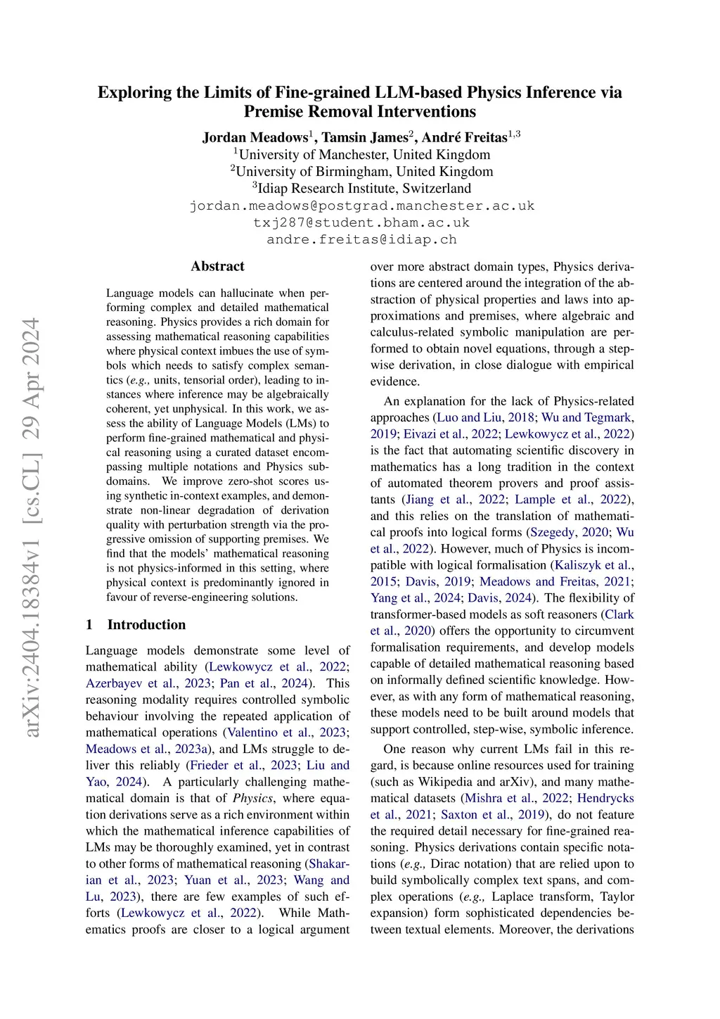 Language models can hallucinate when performing complex and detailed mathematical reasoning. Physics provides a rich domain for assessing mathematical reasoning capabilities where physical context imbues the use of symbols which needs to satisfy complex semantics (\textit{e.g.,} units, tensorial order), leading to instances where inference may be algebraically coherent, yet unphysical. In this work, we assess the ability of Language Models (LMs) to perform fine-grained mathematical and physical reasoning using a curated dataset encompassing multiple notations and Physics subdomains. We improve zero-shot scores using synthetic in-context examples, and demonstrate non-linear degradation of derivation quality with perturbation strength via the progressive omission of supporting premises. We find that the models' mathematical reasoning is not physics-informed in this setting, where physical context is predominantly ignored in favour of reverse-engineering solutions.