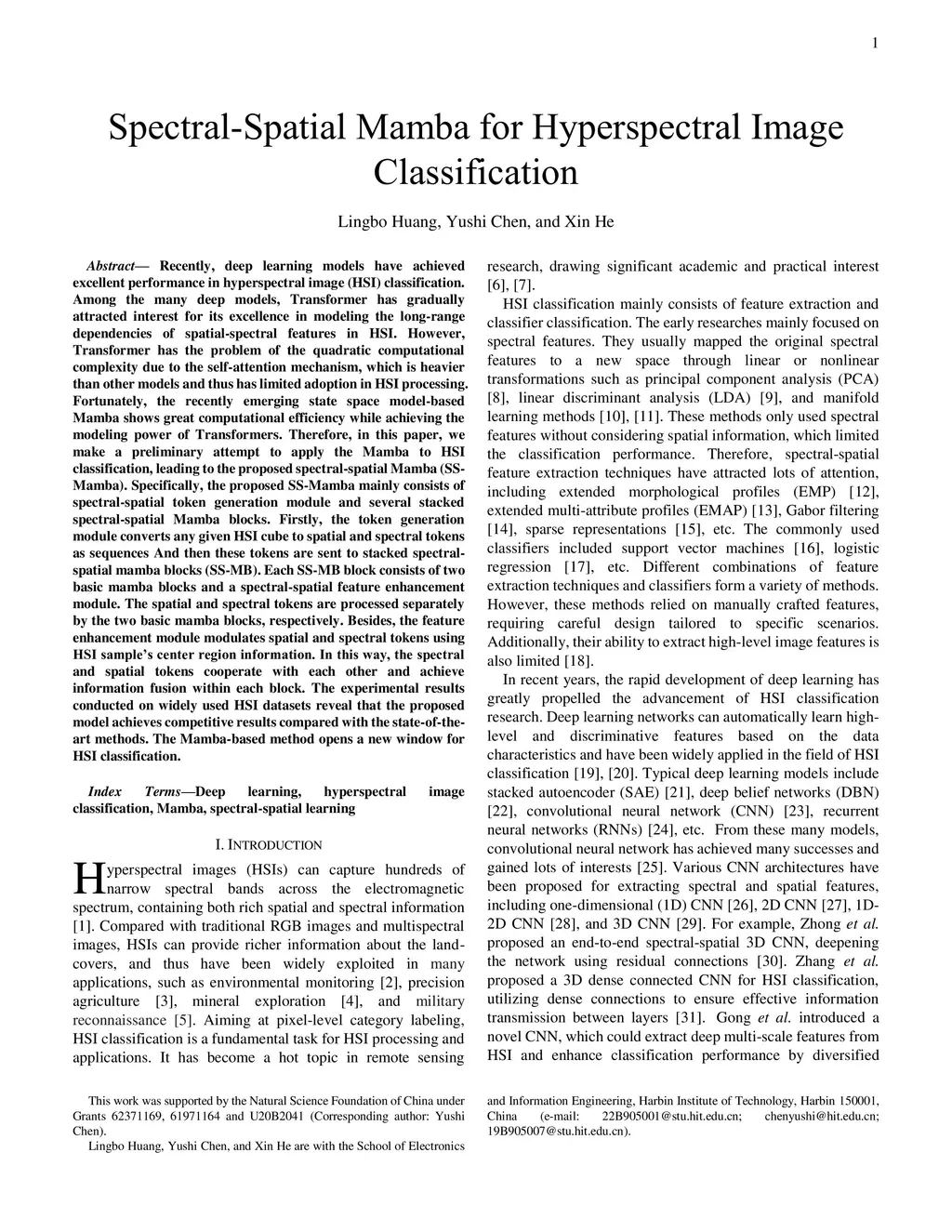Recently, deep learning models have achieved excellent performance in hyperspectral image (HSI) classification. Among the many deep models, Transformer has gradually attracted interest for its excellence in modeling the long-range dependencies of spatial-spectral features in HSI. However, Transformer has the problem of quadratic computational complexity due to the self-attention mechanism, which is heavier than other models and thus has limited adoption in HSI processing. Fortunately, the recently emerging state space model-based Mamba shows great computational efficiency while achieving the modeling power of Transformers. Therefore, in this paper, we make a preliminary attempt to apply the Mamba to HSI classification, leading to the proposed spectral-spatial Mamba (SS-Mamba). Specifically, the proposed SS-Mamba mainly consists of spectral-spatial token generation module and several stacked spectral-spatial Mamba blocks. Firstly, the token generation module converts any given HSI cube to spatial and spectral tokens as sequences. And then these tokens are sent to stacked spectral-spatial mamba blocks (SS-MB). Each SS-MB block consists of two basic mamba blocks and a spectral-spatial feature enhancement module. The spatial and spectral tokens are processed separately by the two basic mamba blocks, respectively. Besides, the feature enhancement module modulates spatial and spectral tokens using HSI sample's center region information. In this way, the spectral and spatial tokens cooperate with each other and achieve information fusion within each block. The experimental results conducted on widely used HSI datasets reveal that the proposed model achieves competitive results compared with the state-of-the-art methods. The Mamba-based method opens a new window for HSI classification.