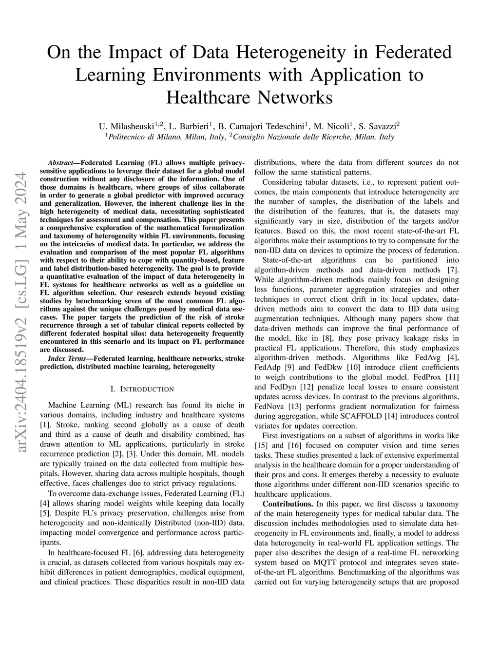 Federated Learning (FL) allows multiple privacy-sensitive applications to leverage their dataset for a global model construction without any disclosure of the information. One of those domains is healthcare, where groups of silos collaborate in order to generate a global predictor with improved accuracy and generalization. However, the inherent challenge lies in the high heterogeneity of medical data, necessitating sophisticated techniques for assessment and compensation. This paper presents a comprehensive exploration of the mathematical formalization and taxonomy of heterogeneity within FL environments, focusing on the intricacies of medical data. In particular, we address the evaluation and comparison of the most popular FL algorithms with respect to their ability to cope with quantity-based, feature and label distribution-based heterogeneity. The goal is to provide a quantitative evaluation of the impact of data heterogeneity in FL systems for healthcare networks as well as a guideline on FL algorithm selection. Our research extends beyond existing studies by benchmarking seven of the most common FL algorithms against the unique challenges posed by medical data use cases. The paper targets the prediction of the risk of stroke recurrence through a set of tabular clinical reports collected by different federated hospital silos: data heterogeneity frequently encountered in this scenario and its impact on FL performance are discussed.