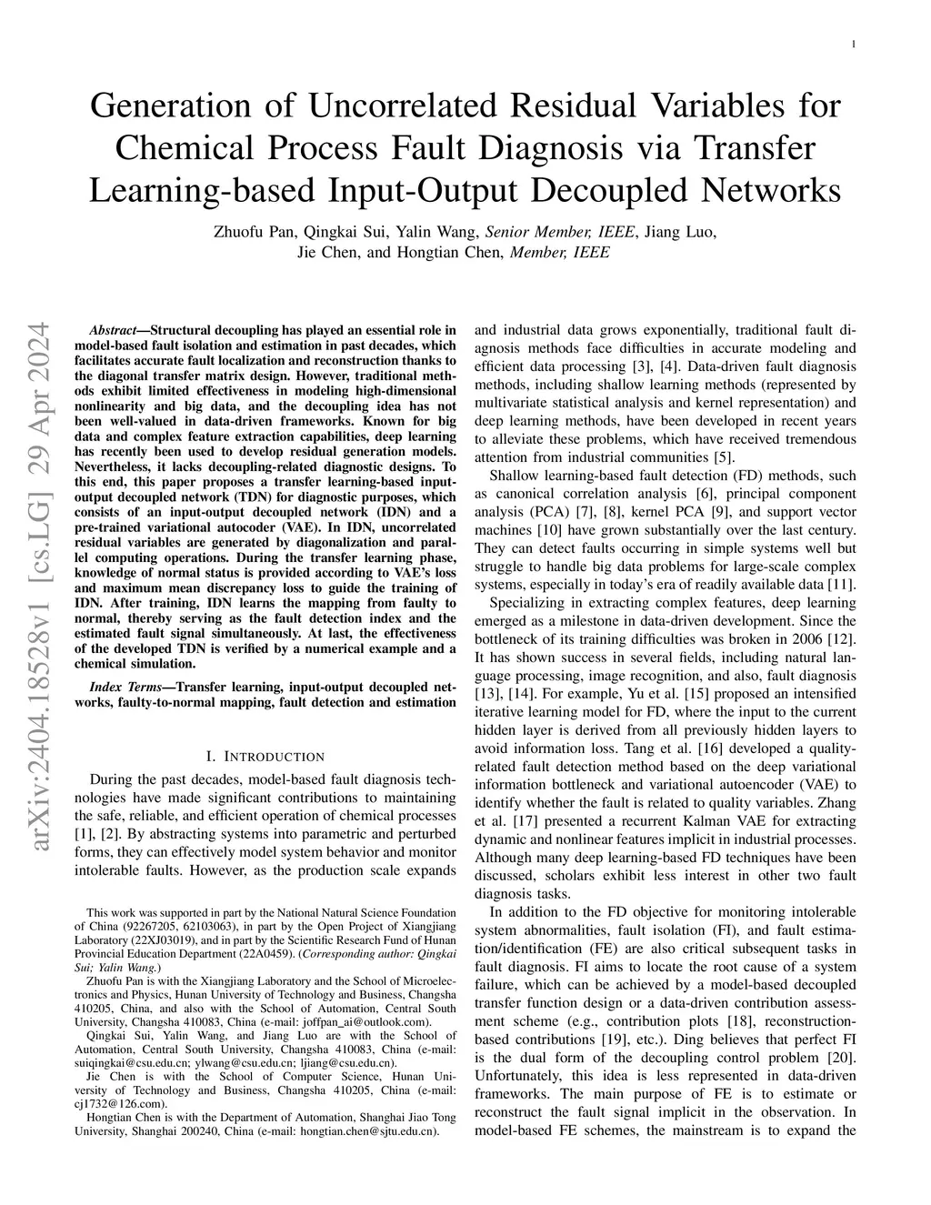 Diagnosis via Transfer Learning-based Input-Output Decoupled Network