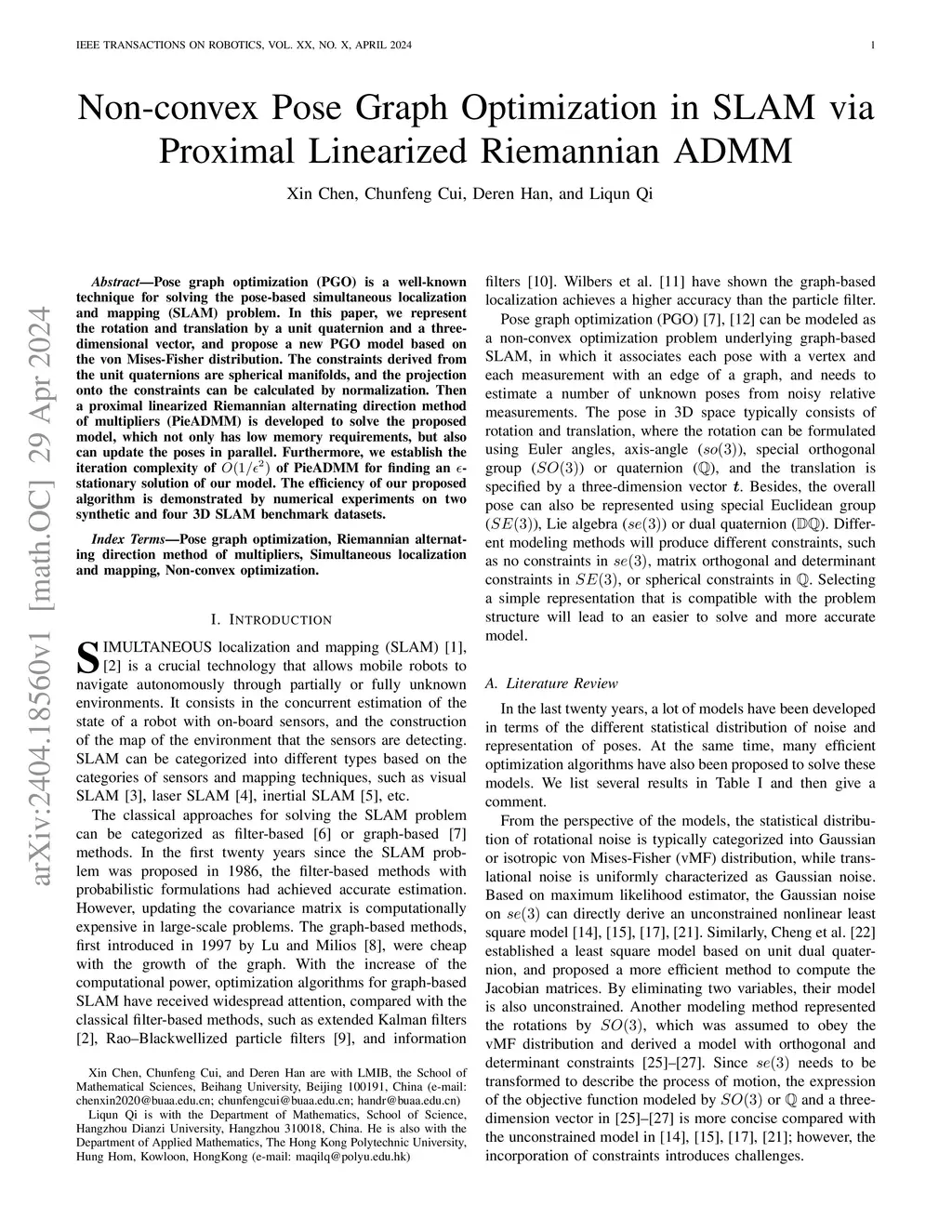 Pose graph optimization (PGO) is a well-known technique for solving the pose-based simultaneous localization and mapping (SLAM) problem. In this paper, we represent the rotation and translation by a unit quaternion and a three-dimensional vector, and propose a new PGO model based on the von Mises-Fisher distribution. The constraints derived from the unit quaternions are spherical manifolds, and the projection onto the constraints can be calculated by normalization. Then a proximal linearized Riemannian alternating direction method of multipliers (PieADMM) is developed to solve the proposed model, which not only has low memory requirements, but also can update the poses in parallel. Furthermore, we establish the iteration complexity of of PieADMM for finding an -stationary solution of our model. The efficiency of our proposed algorithm is demonstrated by numerical experiments on two synthetic and four 3D SLAM benchmark datasets.