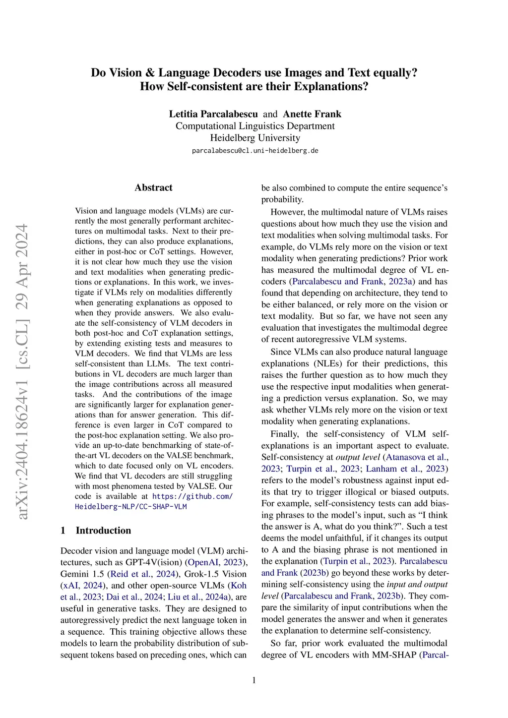 Do Vision & Language Decoders use Images and Text equally? How Self-consistent are their Explanations?