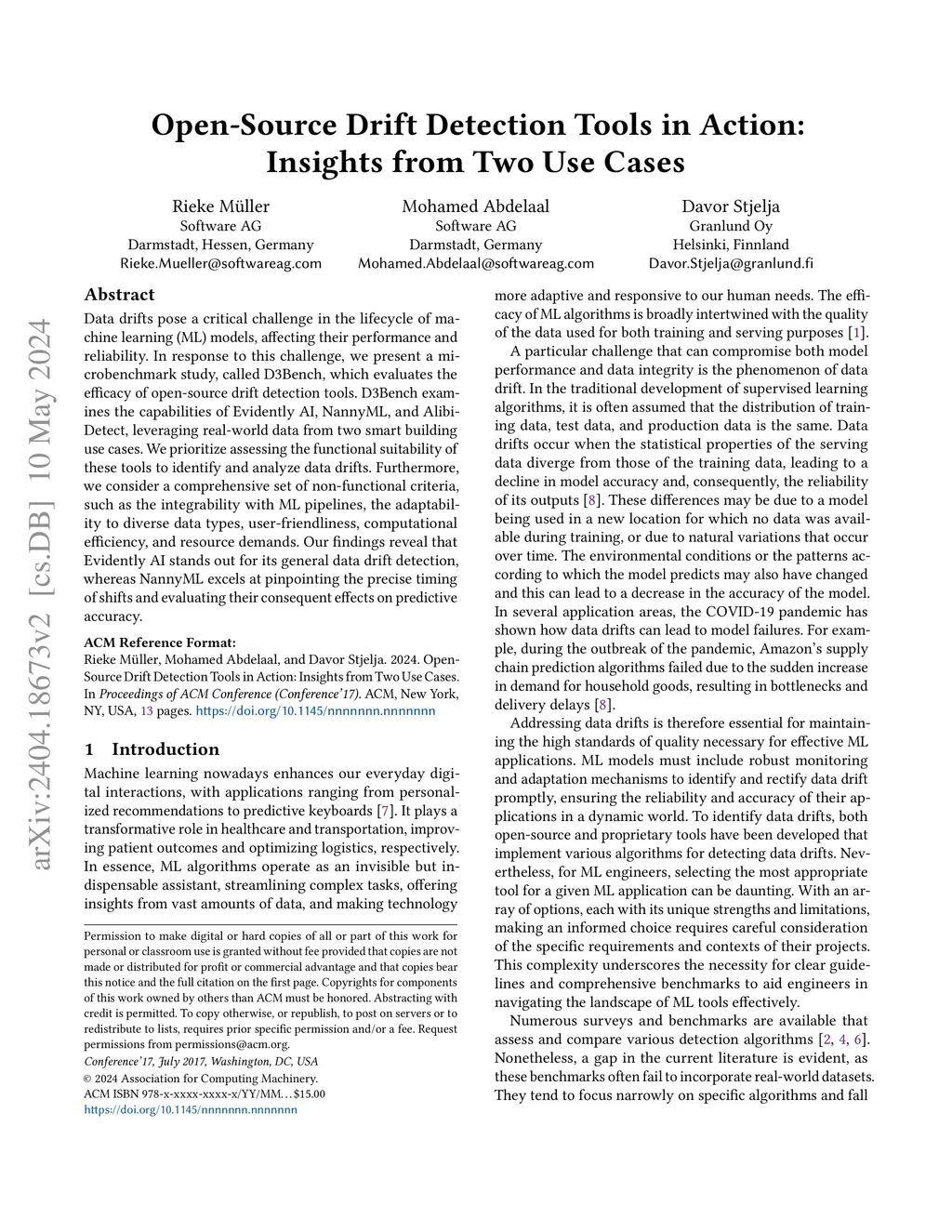 Data drifts pose a critical challenge in the lifecycle of machine learning (ML) models, affecting their performance and reliability. In response to this challenge, we present a microbenchmark study, called D3Bench, which evaluates the efficacy of open-source drift detection tools. D3Bench examines the capabilities of Evidently AI, NannyML, and Alibi-Detect, leveraging real-world data from two smart building use cases.We prioritize assessing the functional suitability of these tools to identify and analyze data drifts. Furthermore, we consider a comprehensive set of non-functional criteria, such as the integrability with ML pipelines, the adaptability to diverse data types, user-friendliness, computational efficiency, and resource demands. Our findings reveal that Evidently AI stands out for its general data drift detection, whereas NannyML excels at pinpointing the precise timing of shifts and evaluating their consequent effects on predictive accuracy.