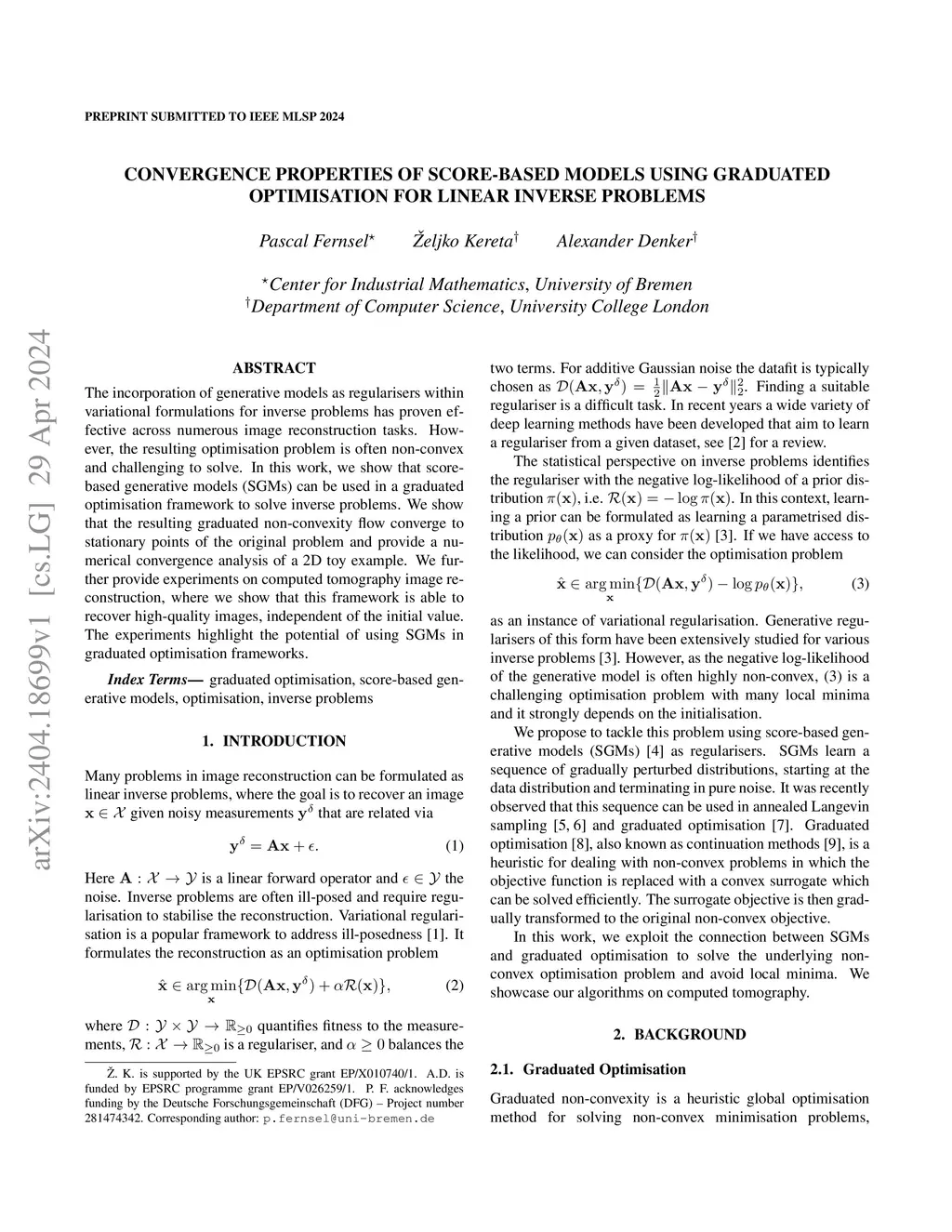 The incorporation of generative models as regularisers within variational formulations for inverse problems has proven effective across numerous image reconstruction tasks. However, the resulting optimisation problem is often non-convex and challenging to solve. In this work, we show that score-based generative models (SGMs) can be used in a graduated optimisation framework to solve inverse problems. We show that the resulting graduated non-convexity flow converge to stationary points of the original problem and provide a numerical convergence analysis of a 2D toy example. We further provide experiments on computed tomography image reconstruction, where we show that this framework is able to recover high-quality images, independent of the initial value. The experiments highlight the potential of using SGMs in graduated optimisation frameworks.
