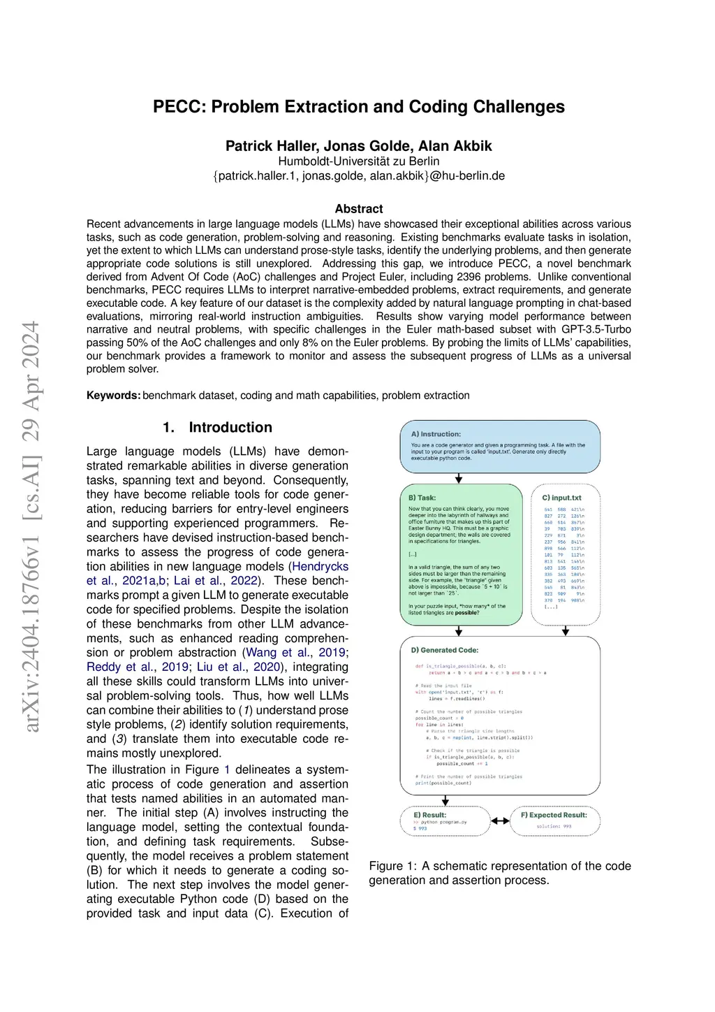 Recent advancements in large language models (LLMs) have showcased their exceptional abilities across various tasks, such as code generation, problem-solving and reasoning. Existing benchmarks evaluate tasks in isolation, yet the extent to which LLMs can understand prose-style tasks, identify the underlying problems, and then generate appropriate code solutions is still unexplored. Addressing this gap, we introduce PECC, a novel benchmark derived from Advent Of Code (AoC) challenges and Project Euler, including 2396 problems. Unlike conventional benchmarks, PECC requires LLMs to interpret narrative-embedded problems, extract requirements, and generate executable code. A key feature of our dataset is the complexity added by natural language prompting in chat-based evaluations, mirroring real-world instruction ambiguities. Results show varying model performance between narrative and neutral problems, with specific challenges in the Euler math-based subset with GPT-3.5-Turbo passing 50% of the AoC challenges and only 8% on the Euler problems. By probing the limits of LLMs' capabilities, our benchmark provides a framework to monitor and assess the subsequent progress of LLMs as a universal problem solver.