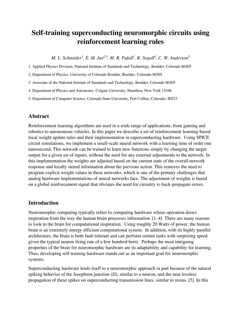 Reinforcement learning algorithms are used in a wide range of applications, from gaming and robotics to autonomous vehicles. In this paper we describe a set of reinforcement learning-based local weight update rules and their implementation in superconducting hardware. Using SPICE circuit simulations, we implement a small-scale neural network with a learning time of order one nanosecond. This network can be trained to learn new functions simply by changing the target output for a given set of inputs, without the need for any external adjustments to the network. In this implementation the weights are adjusted based on the current state of the overall network response and locally stored information about the previous action. This removes the need to program explicit weight values in these networks, which is one of the primary challenges that analog hardware implementations of neural networks face. The adjustment of weights is based on a global reinforcement signal that obviates the need for circuitry to back-propagate errors.