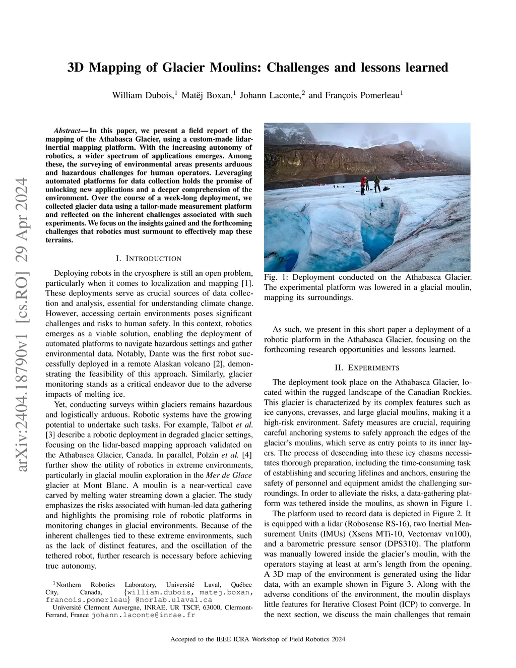 In this paper, we present a field report of the mapping of the Athabasca Glacier, using a custom-made lidar-inertial mapping platform. With the increasing autonomy of robotics, a wider spectrum of applications emerges. Among these, the surveying of environmental areas presents arduous and hazardous challenges for human operators. Leveraging automated platforms for data collection holds the promise of unlocking new applications and a deeper comprehension of the environment. Over the course of a week-long deployment, we collected glacier data using a tailor-made measurement platform and reflected on the inherent challenges associated with such experiments. We focus on the insights gained and the forthcoming challenges that robotics must surmount to effectively map these terrains.