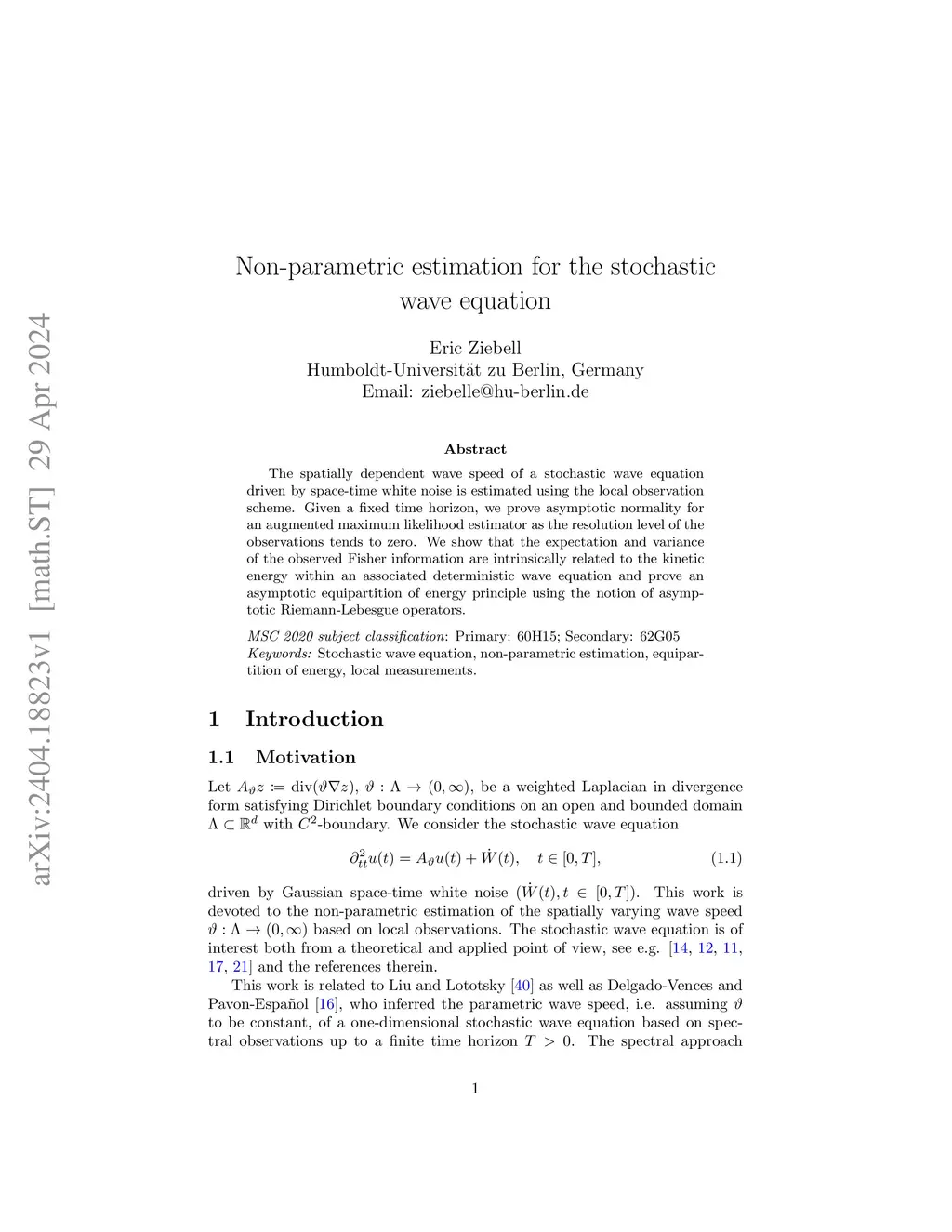 The spatially dependent wave speed of a stochastic wave equation driven by space-time white noise is estimated using the local observation scheme. Given a fixed time horizon, we prove asymptotic normality for an augmented maximum likelihood estimator as the resolution level of the observations tends to zero. We show that the expectation and variance of the observed Fisher information are intrinsically related to the kinetic energy within an associated deterministic wave equation and prove an asymptotic equipartition of energy principle using the notion of asymptotic Riemann-Lebesgue operators.
