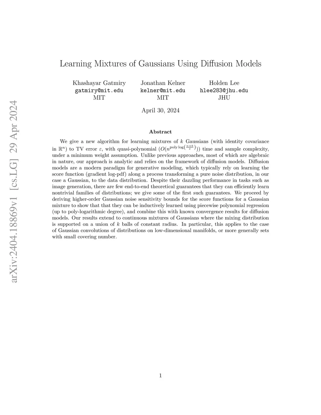 We give a new algorithm for learning mixtures of Gaussians (with identity covariance in ) to TV error , with quasi-polynomial () time and sample complexity, under a minimum weight assumption. Our results extend to continuous mixtures of Gaussians where the mixing distribution is supported on a union of balls of constant radius. In particular, this applies to the case of Gaussian convolutions of distributions on low-dimensional manifolds, or more generally sets with small covering number, for which no sub-exponential algorithm was previously known. Unlike previous approaches, most of which are algebraic in nature, our approach is analytic and relies on the framework of diffusion models. Diffusion models are a modern paradigm for generative modeling, which typically rely on learning the score function (gradient log-pdf) along a process transforming a pure noise distribution, in our case a Gaussian, to the data distribution. Despite their dazzling performance in tasks such as image generation, there are few end-to-end theoretical guarantees that they can efficiently learn nontrivial families of distributions; we give some of the first such guarantees. We proceed by deriving higher-order Gaussian noise sensitivity bounds for the score functions for a Gaussian mixture to show that that they can be inductively learned using piecewise polynomial regression (up to poly-logarithmic degree), and combine this with known convergence results for diffusion models.