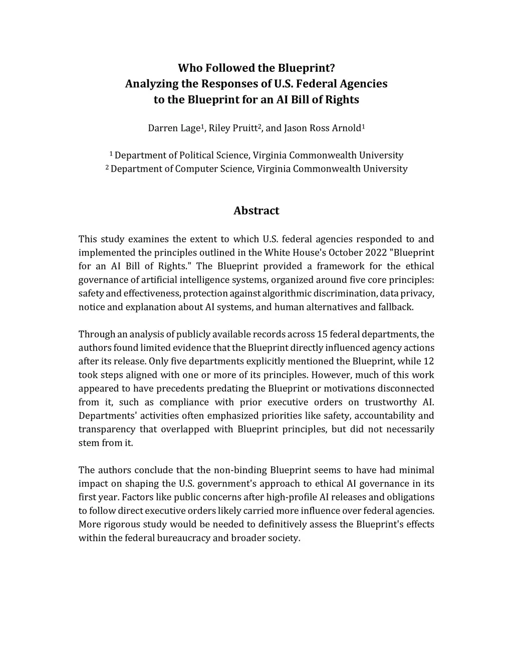 This study examines the extent to which U.S. federal agencies responded to and implemented the principles outlined in the White House's October 2022 "Blueprint for an AI Bill of Rights." The Blueprint provided a framework for the ethical governance of artificial intelligence systems, organized around five core principles: safety and effectiveness, protection against algorithmic discrimination, data privacy, notice and explanation about AI systems, and human alternatives and fallback. Through an analysis of publicly available records across 15 federal departments, the authors found limited evidence that the Blueprint directly influenced agency actions after its release. Only five departments explicitly mentioned the Blueprint, while 12 took steps aligned with one or more of its principles. However, much of this work appeared to have precedents predating the Blueprint or motivations disconnected from it, such as compliance with prior executive orders on trustworthy AI. Departments' activities often emphasized priorities like safety, accountability and transparency that overlapped with Blueprint principles, but did not necessarily stem from it. The authors conclude that the non-binding Blueprint seems to have had minimal impact on shaping the U.S. government's approach to ethical AI governance in its first year. Factors like public concerns after high-profile AI releases and obligations to follow direct executive orders likely carried more influence over federal agencies. More rigorous study would be needed to definitively assess the Blueprint's effects within the federal bureaucracy and broader society.