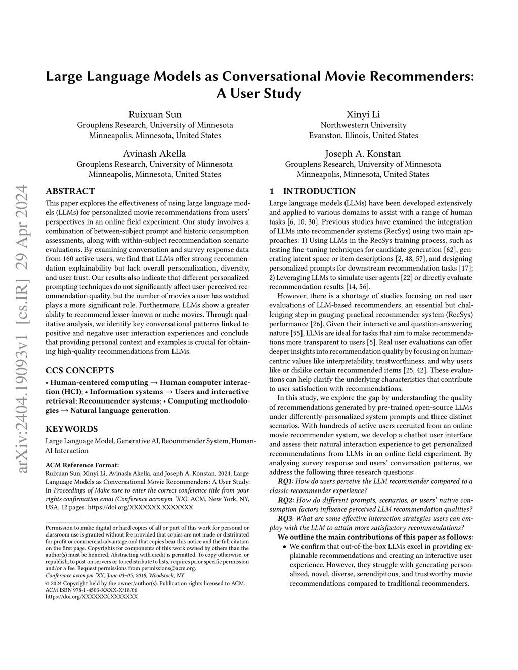 Large Language Models as Conversational Movie Recommenders: A User Study