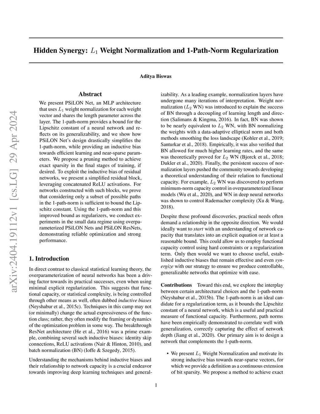 We present PSiLON Net, an MLP architecture that uses weight normalization for each weight vector and shares the length parameter across the layer. The 1-path-norm provides a bound for the Lipschitz constant of a neural network and reflects on its generalizability, and we show how PSiLON Net's design drastically simplifies the 1-path-norm, while providing an inductive bias towards efficient learning and near-sparse parameters. We propose a pruning method to achieve exact sparsity in the final stages of training, if desired. To exploit the inductive bias of residual networks, we present a simplified residual block, leveraging concatenated ReLU activations. For networks constructed with such blocks, we prove that considering only a subset of possible paths in the 1-path-norm is sufficient to bound the Lipschitz constant. Using the 1-path-norm and this improved bound as regularizers, we conduct experiments in the small data regime using overparameterized PSiLON Nets and PSiLON ResNets, demonstrating reliable optimization and strong performance.