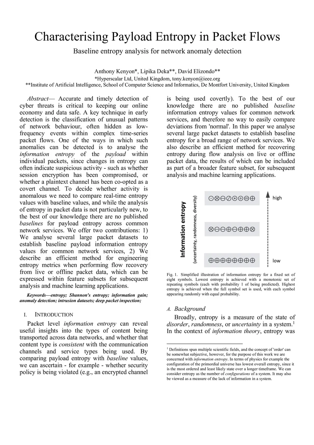 Accurate and timely detection of cyber threats is critical to keeping our online economy and data safe. A key technique in early detection is the classification of unusual patterns of network behaviour, often hidden as low-frequency events within complex time-series packet flows. One of the ways in which such anomalies can be detected is to analyse the information entropy of the payload within individual packets, since changes in entropy can often indicate suspicious activity - such as whether session encryption has been compromised, or whether a plaintext channel has been co-opted as a covert channel. To decide whether activity is anomalous we need to compare real-time entropy values with baseline values, and while the analysis of entropy in packet data is not particularly new, to the best of our knowledge there are no published baselines for payload entropy across common network services. We offer two contributions: 1) We analyse several large packet datasets to establish baseline payload information entropy values for common network services, 2) We describe an efficient method for engineering entropy metrics when performing flow recovery from live or offline packet data, which can be expressed within feature subsets for subsequent analysis and machine learning applications.