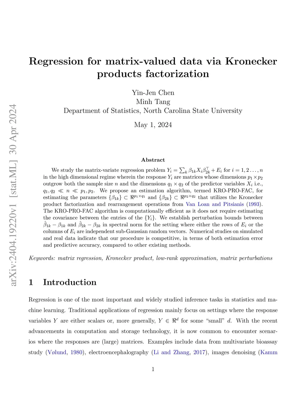 Regression for matrix-valued data via Kronecker products factorization