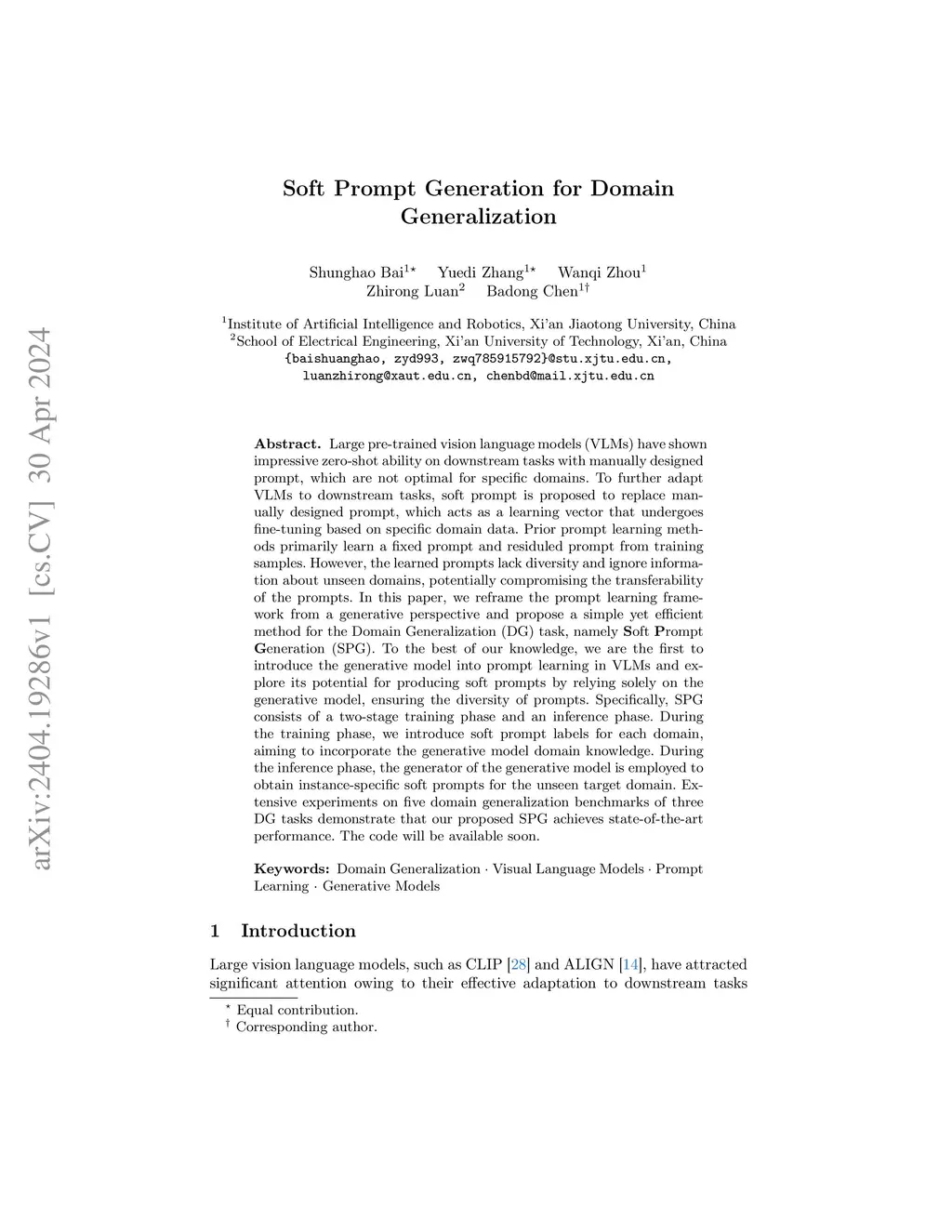 Large pre-trained vision language models (VLMs) have shown impressive zero-shot ability on downstream tasks with manually designed prompt. To further adapt VLMs to downstream tasks, soft prompt is proposed to replace manually designed prompt, which undergoes fine-tuning based on specific domain data. Prior prompt learning methods primarily learn a fixed prompt or residuled prompt from training samples. However, the learned prompts lack diversity and ignore information about unseen domains. In this paper, we reframe the prompt learning framework from a generative perspective and propose a simple yet efficient method for the Domain Generalization (DG) task, namely Soft Prompt Generation (SPG). Specifically, SPG consists of a two-stage training phase and an inference phase. During the training phase, we introduce soft prompt label for each domain, aiming to incorporate the generative model domain knowledge. During the inference phase, the generator of the generative model is employed to obtain instance-specific soft prompts for the unseen target domain. Extensive experiments on five domain generalization benchmarks of three DG tasks demonstrate that SPG achieves state-of-the-art performance. The code is available at https://github.com/renytek13/Soft-Prompt-Generation-with-CGAN.