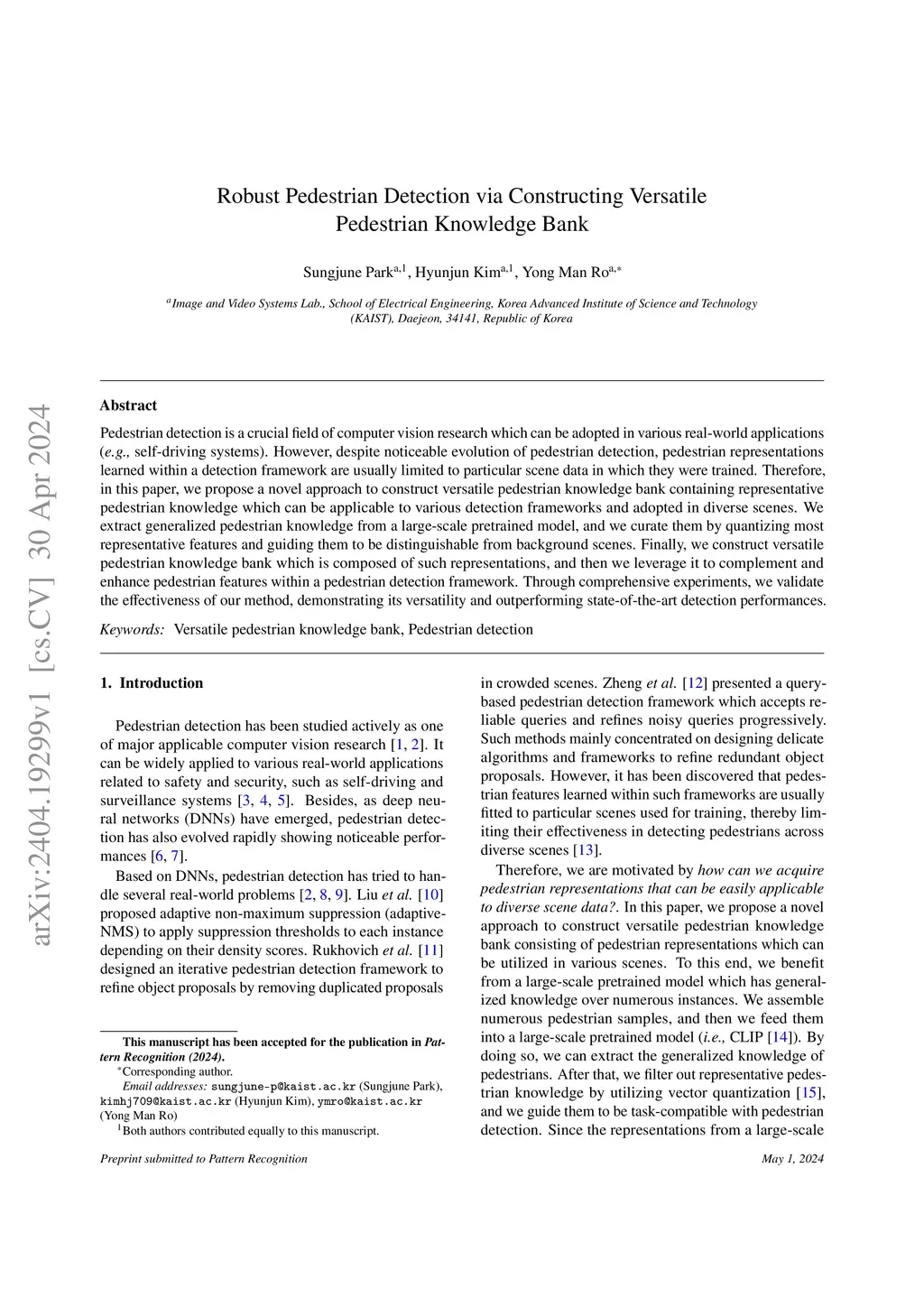 Pedestrian detection is a crucial field of computer vision research which can be adopted in various real-world applications (e.g., self-driving systems). However, despite noticeable evolution of pedestrian detection, pedestrian representations learned within a detection framework are usually limited to particular scene data in which they were trained. Therefore, in this paper, we propose a novel approach to construct versatile pedestrian knowledge bank containing representative pedestrian knowledge which can be applicable to various detection frameworks and adopted in diverse scenes. We extract generalized pedestrian knowledge from a large-scale pretrained model, and we curate them by quantizing most representative features and guiding them to be distinguishable from background scenes. Finally, we construct versatile pedestrian knowledge bank which is composed of such representations, and then we leverage it to complement and enhance pedestrian features within a pedestrian detection framework. Through comprehensive experiments, we validate the effectiveness of our method, demonstrating its versatility and outperforming state-of-the-art detection performances.