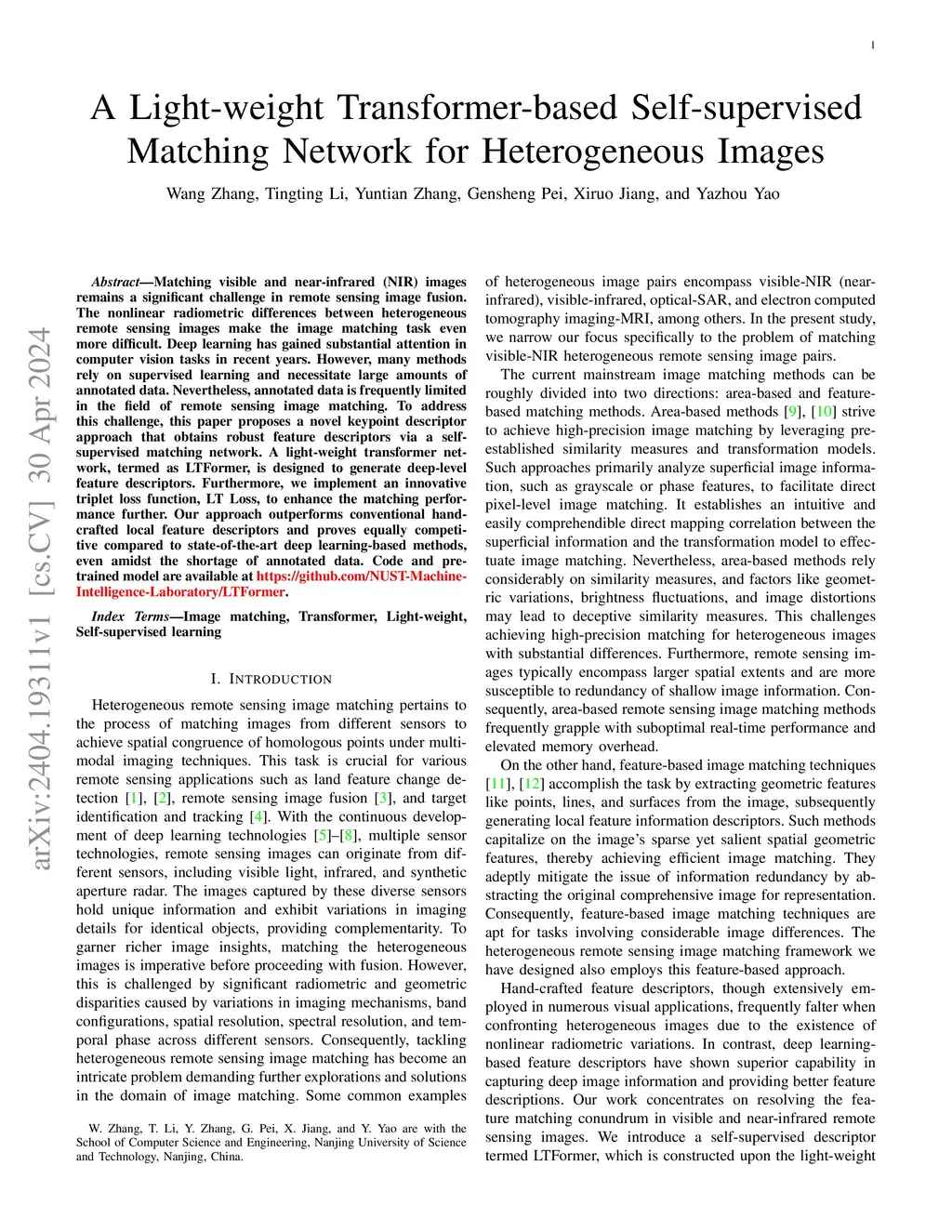 Matching visible and near-infrared (NIR) images remains a significant challenge in remote sensing image fusion. The nonlinear radiometric differences between heterogeneous remote sensing images make the image matching task even more difficult. Deep learning has gained substantial attention in computer vision tasks in recent years. However, many methods rely on supervised learning and necessitate large amounts of annotated data. Nevertheless, annotated data is frequently limited in the field of remote sensing image matching. To address this challenge, this paper proposes a novel keypoint descriptor approach that obtains robust feature descriptors via a self-supervised matching network. A light-weight transformer network, termed as LTFormer, is designed to generate deep-level feature descriptors. Furthermore, we implement an innovative triplet loss function, LT Loss, to enhance the matching performance further. Our approach outperforms conventional hand-crafted local feature descriptors and proves equally competitive compared to state-of-the-art deep learning-based methods, even amidst the shortage of annotated data.