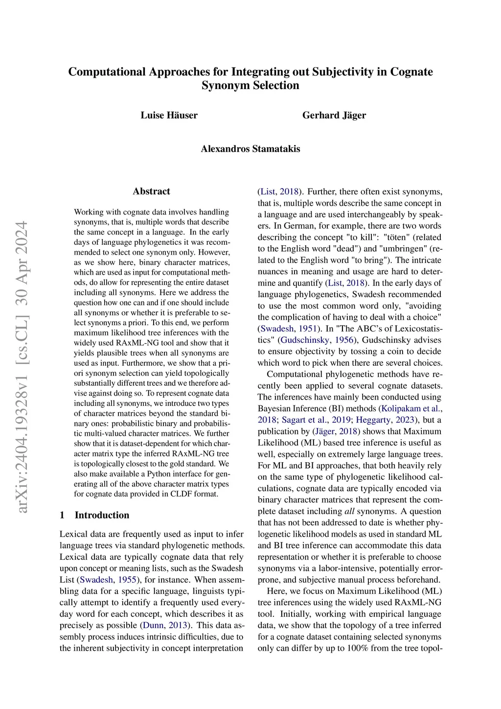 Working with cognate data involves handling synonyms, that is, multiple words that describe the same concept in a language. In the early days of language phylogenetics it was recommended to select one synonym only. However, as we show here, binary character matrices, which are used as input for computational methods, do allow for representing the entire dataset including all synonyms. Here we address the question how one can and if one should include all synonyms or whether it is preferable to select synonyms a priori. To this end, we perform maximum likelihood tree inferences with the widely used RAxML-NG tool and show that it yields plausible trees when all synonyms are used as input. Furthermore, we show that a priori synonym selection can yield topologically substantially different trees and we therefore advise against doing so. To represent cognate data including all synonyms, we introduce two types of character matrices beyond the standard binary ones: probabilistic binary and probabilistic multi-valued character matrices. We further show that it is dataset-dependent for which character matrix type the inferred RAxML-NG tree is topologically closest to the gold standard. We also make available a Python interface for generating all of the above character matrix types for cognate data provided in CLDF format.